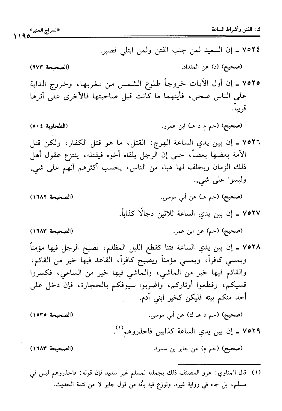 (¬1) قال المناوي: عزو المصنف ذلك بجملته لمسلم غير سديد فإن قوله: فاحذروهم ليس في مسلم، بل جاء في رواية غيره. ونوزع فيه بأنه من قول جابر لا من تتمة الحديث.