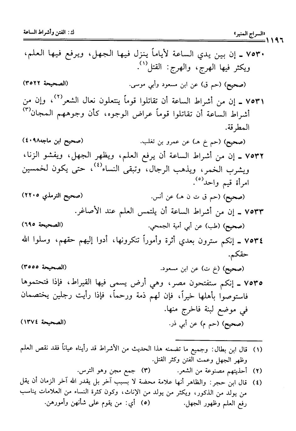 7530 - إن بين يدي الساعة لأيامًا ينزل فيها الجهل، ويرفع فيها العلم، ويكثر فيها الهرج، والهرج: القتل (¬1).