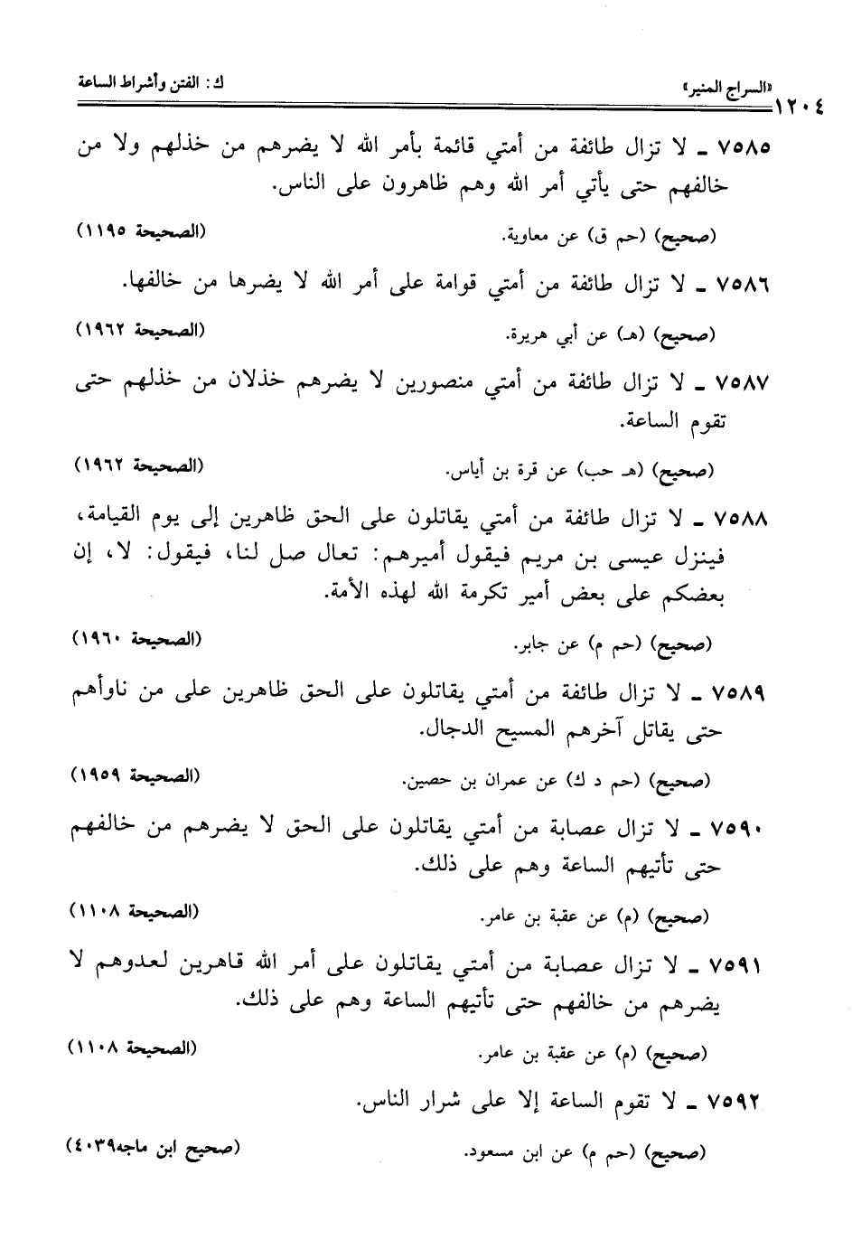 7590 - لا تزال عصابة من أمتي يقاتلون على الحق لا يضرهم من خالفهم حتى تأتيهم الساعة وهم على ذلك.