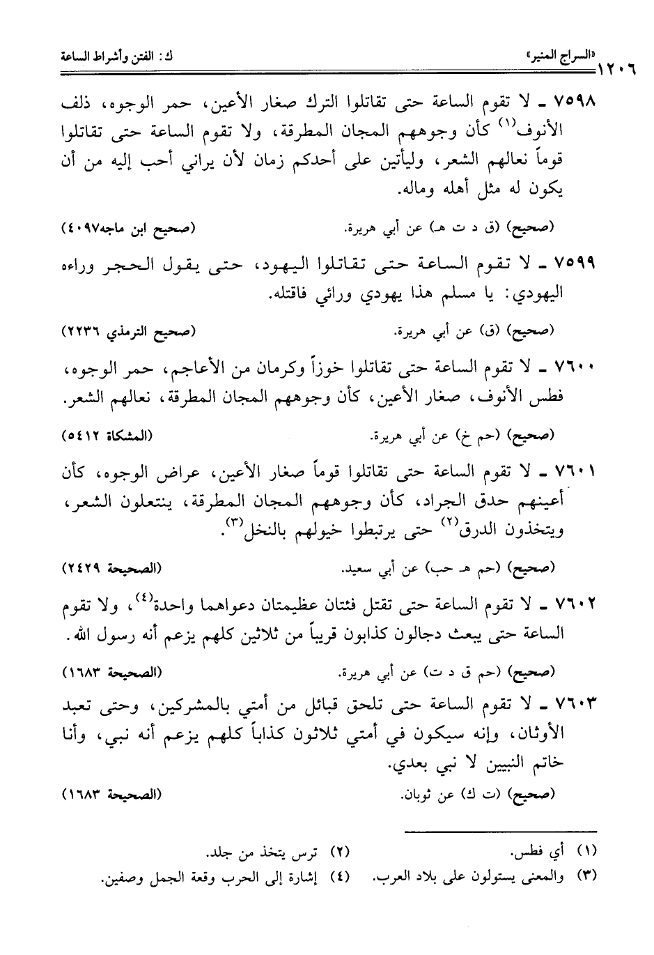 7601 - لا تقوم الساعة حتى تقاتلوا قومًا صغار الأعين، عراض الوجوه، كأن أعينهم حدق الجراد، كأن وجوههم المجان المطرقة، ينتعلون الشعر، ويتخذون الدرق (¬2) حتى يرتبطوا خيولهم بالنخل (¬3).
