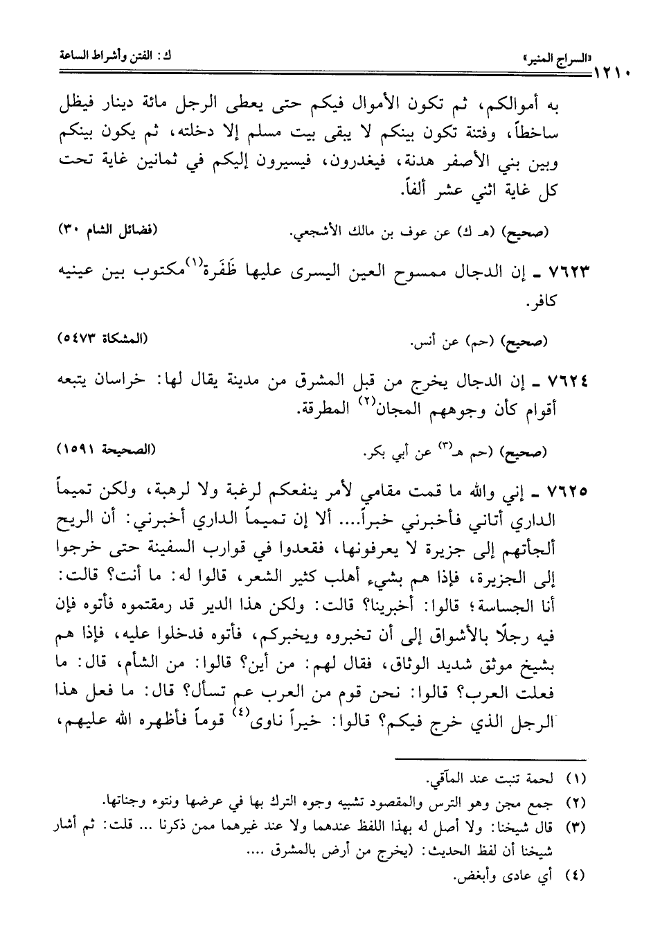 7625 - إني واللَّه ما قمت مقامي لأمر ينفعكم لرغبة ولا لرهبة، ولكن تميمًا الداري أتاني فأخبرني خبرًا. . . . ألا إن تميمًا الداري أخبرني: أن الريح ألجأتهم إلى جزيرة لا يعرفونها، فقعدوا في قوارب السفينة حتى خرجوا إلى الجزيرة، فإذا هم بشيء أهلب كثير الشعر، قالوا له: ما أنت؟ قالت: أنا الجساسة؛ قالوا: أخبرينا؟ قالت: ولكن هذا الدير قد رمقتموه فأتوه فإن فيه رجلًا بالأشواق إلى أن تخبروه ويخبركم، فأتوه فدخلوا عليه، فإذا هم بشيخ موثق شديد الوثاق، فقال لهم: من أين؟ قالوا: من الشأم، قال: ما فعلت العرب؟ قالوا: نحن قوم من العرب عم تسأل؟ قال: ما فعل هذا الرجل الذي خرج فيكم؟ قالوا: خيرًا ناوى (¬4) قومًا فأظهره اللَّه عليهم،