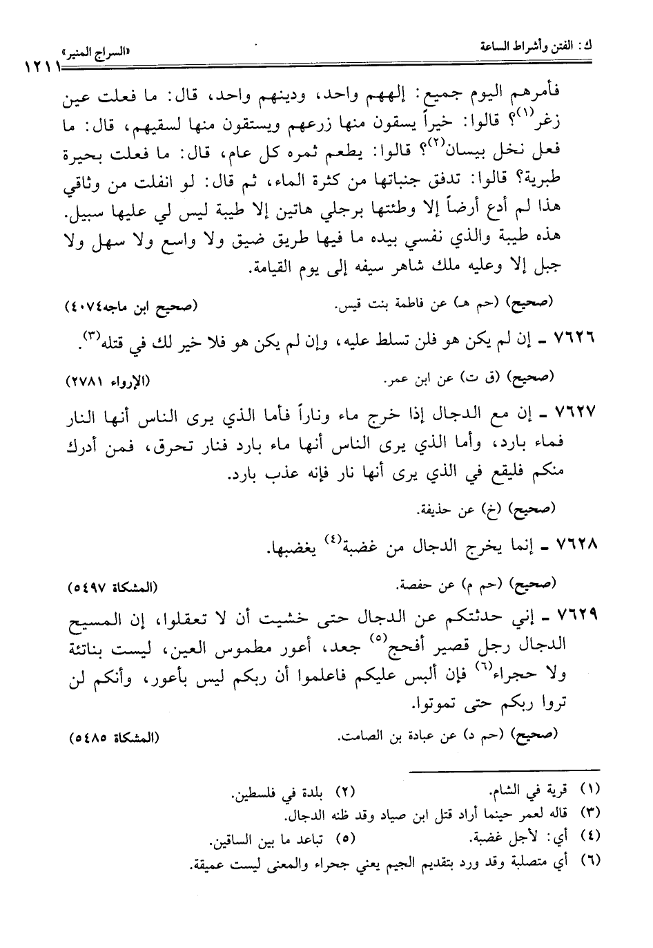7629 - إني حدثتكم عن الدجال حتى خشيمت أن لا تعقلوا، إن المسيح الدجال رجل قصير أفحج (¬5) جعد، أعور مطموس العين، ليست بناتئة ولا حجراء (¬6) فإن ألبس عليكم فاعلموا أن ربكم ليس بأعور، وأنكم لن تروا ربكم حتى تموتوا.
