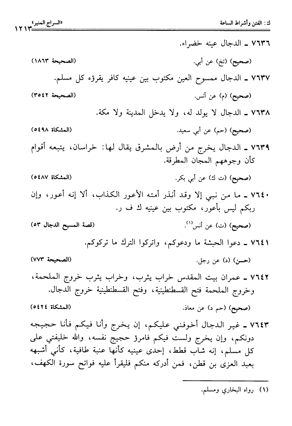 7637 - الدجال ممسوح العين مكتوب بين عينيه كافر يقرؤه كل مسلم.