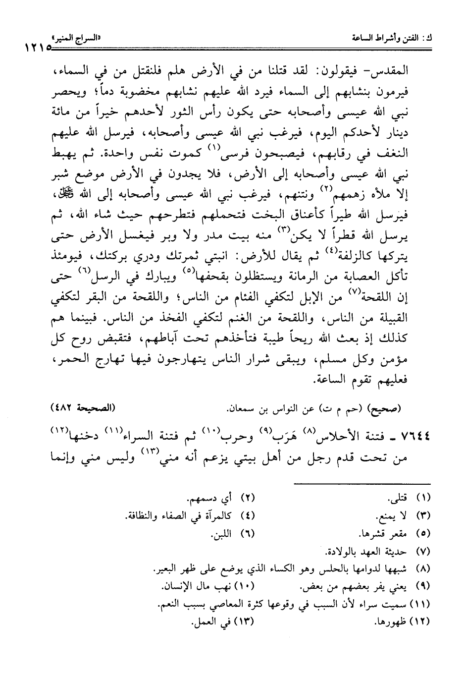المقدس- فيقولون: لقد قتلنا من في الأرض هلم فلنقتل من في السماء، فيرمون بنشابهم إلى السماء فيرد اللَّه عليهم نشابهم مخضوبة دمًا؛ ويحصر نبي اللَّه عيسى وأصحابه حتى يكون رأس الثور لأحدهم خيرًا من مائة دينار لأحدكم اليوم، فيرغب نبي اللَّه عيسى وأصحابه، فيرسل اللَّه عليهم النغف في رقابهم، فيصبحون فرسى (¬1) كموت نفس واحدة. ثم يهبط نبي اللَّه عيسى وأصحابه إلى الأرض، فلا يجدون في الأرض موضع شبر إلا ملأه زهمهم (¬2) ونتنهم، فيرغب نبي اللَّه عيسى وأصحابه إلى اللَّه عز وجل، فيرسل اللَّه طيرًا كأعناق البخت فتحملهم فتطرحهم حيث شاء اللَّه، ثم يرسل اللَّه قطرًا لا يكن (¬3) منه بيت مدر ولا وبر فيغسل الأرض حتى يتركها كالزلفة (¬4) ثم يقال للأرض: انبتي ثمرتك ودري بركتك، فيومئذ تأكل العصابة من الرمانة ويستظلون بقحفها (¬5) ويبارك في الرسل (¬6) حتى إن اللقحة (¬7) من الإبل لتكفي الفئام من الناس؛ واللقحة من البقر لتكفي القبيلة من الناس، واللقحة من الغنم لتكفي الفخذ من الناس. فبينما هم كذلك إذ بعث اللَّه ريحًا طيبة فتأخذهم تحت آباطهم، فتقبض روح كل مؤمن وكل مسلم، ويبقى شرار الناس يتهارجون فيها تهارج الحمر، فعليهم تقوم الساعة.