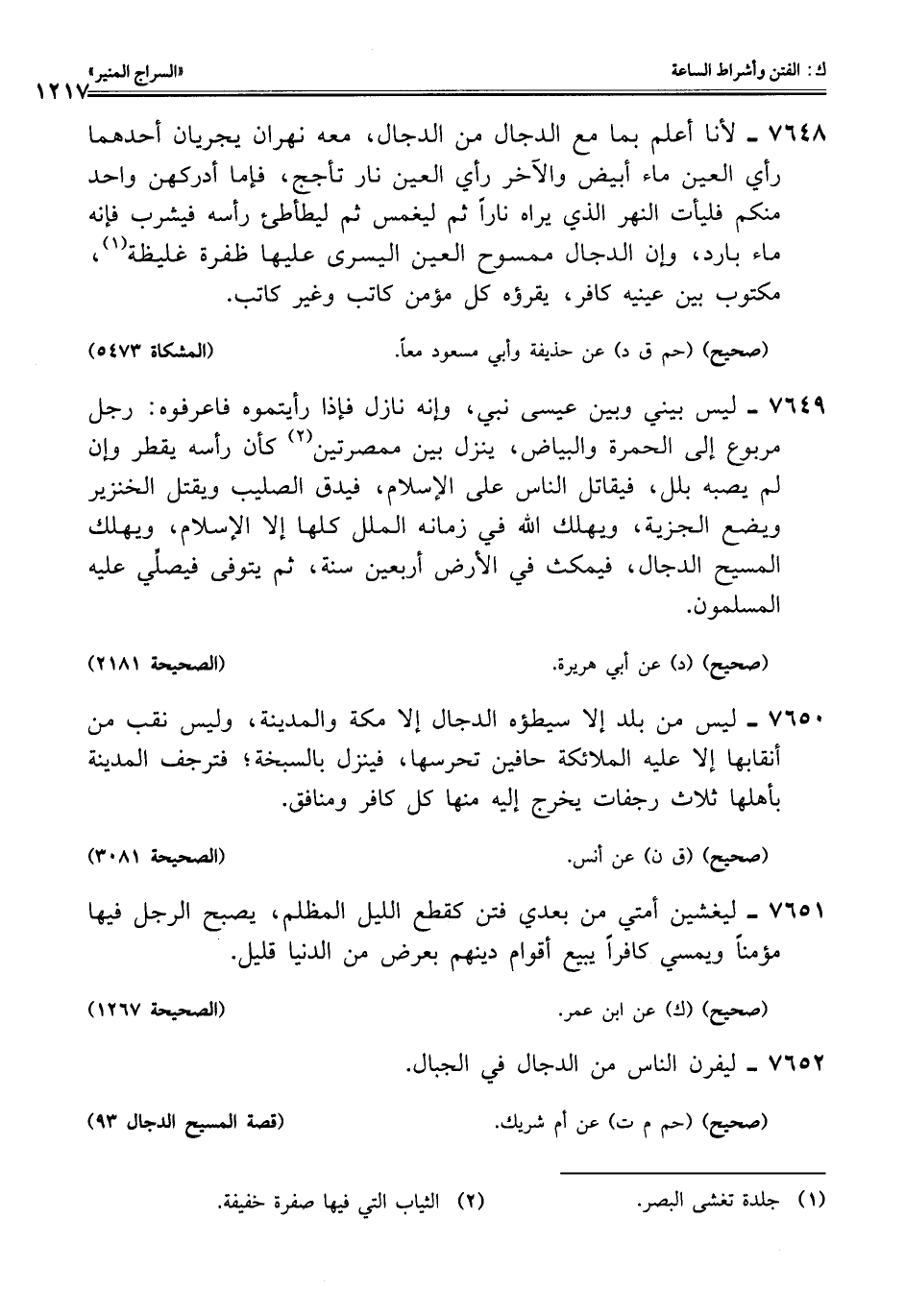 7650 - ليس من بلد إلا سيطؤه الدجال إلا مكة والمدينة، وليس نقب من أنقابها إلا عليه الملائكة حافين تحرسها، فينزل بالسبخة؛ فترجف المدينة بأهلها ثلاث رجفات يخرج إليه منها كل كافر ومنافق.
