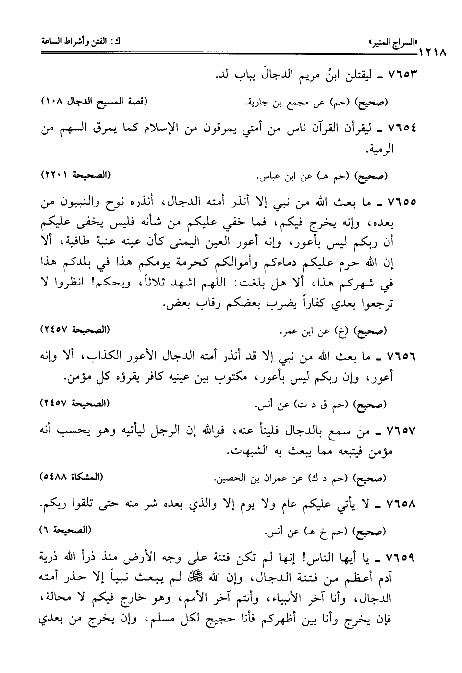 7659 - يا أيها الناس! إنها لم تكن فتنة على وجه الأرض منذ ذرأ اللَّه ذرية آدم أعظم من فتنة الدجال، وإن اللَّه عز وجل لم يبعث نبيًا إلا حذر أمته الدجال، وأنا آخر الأنبياء، وأنتم آخر الأمم، وهو خارج فيكم لا محالة، فإن يخرج وأنا بين أظهركم فأنا حجيج لكل مسلم، وإن يخرج من بعدي