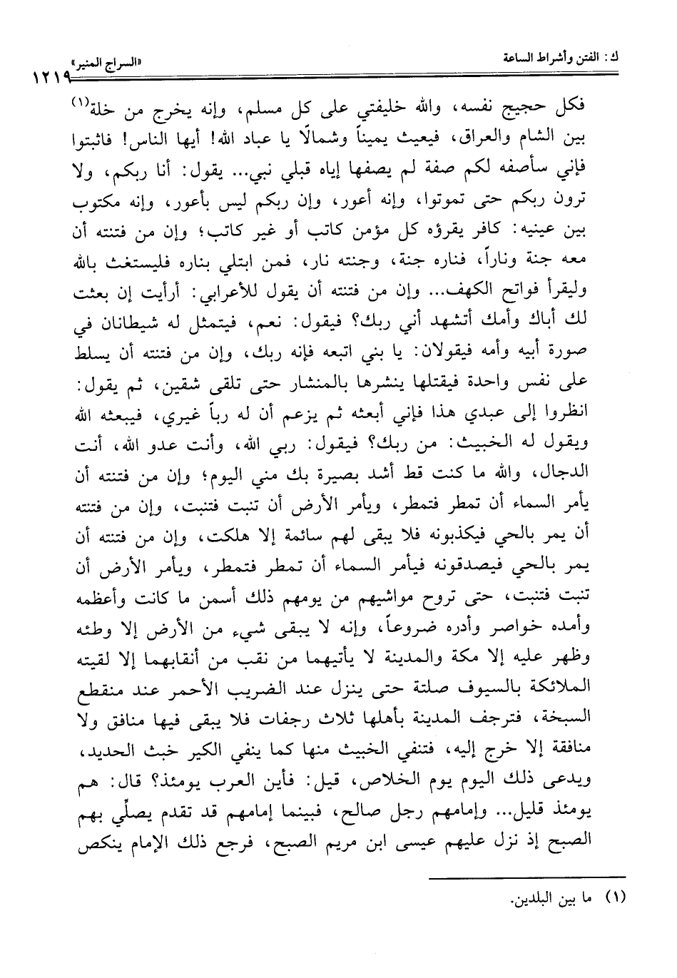 فكل حجيج نفسه، واللَّه خليفتي على كل مسلم، وإنه يخرج من خلة (¬1) بين الشام والعراق، فيعيث يمينًا وشمالًا يا عباد اللَّه! أيها الناس! فاثبتوا فإني سأصفه لكم صفة لم يصفها إياه قبلي نبي. . . يقول: أنا ربكم، ولا ترون ربكم حتى تموتوا، وإنه أعور، وإن ربكم ليس بأعور، وإنه مكتوب بين عينيه: كافر يقرؤه كل مؤمن كاتب أو غير كاتب؛ وإن من فتنته أن معه جنة ونارًا، فناره جنة، وجنته نار، فمن ابتلي بناره فليستغث باللَّه وليقرأ فواتح الكهف. . . وإن من فتنته أن يقول للأعرابي: أرأيت إن بعثت لك أباك وأمك أتشهد أني ربك؟ فيقول: نعم، فيتمثل له شيطانان في صورة أبيه وأمه فيقولان: يا بني اتبعه فإنه ربك، وإن من فتنته أن يسلط على نفس واحدة فيقتلها ينشرها بالمنشار حتى تلقى شقين، ثم يقول: انظروا إلى عبدي هذا فإني أبعثه ثم يزعم أن له ربًا غيري، فيبعثه اللَّه ويقول له الخبيث: من ربك؟ فيقول: ربي اللَّه، وأنت عدو اللَّه، أنت الدجال، واللَّه ما كنت قط أشد بصيرة بك مني اليوم؛ وإن من فتنته أن يأمر السماء أن تمطر فتمطر، ويأمر الأرض أن تنبت فتنبت، وإن من فتنته أن يمر بالحي فيكذبونه فلا يبقى لهم سائمة إلا هلكت، وإن من فتنته أن يمر بالحي فيصدقونه فيأمر السماء أن تمطر فتمطر، ويأمر الأرض أن تنبت فتنبت، حتى تروح مواشيهم من يومهم ذلك أسمن ما كانت وأعظمه وأمده خواصر وأدره ضروعًا، وإنه لا يبقى شيء من الأرض إلا وطئه وظهر عليه إلا مكة والمدينة لا يأتيهما من نقب من أنقابهما إلا لقيته الملائكة بالسيوف صلتة حتى ينزل عند الضريب الأحمر عند منقطع السبخة، فترجف المدينة بأهلها ثلاث رجفات فلا يبقى فيها منافق ولا منافقة إلا خرج إليه، فتنفي الخبيث منها كما بينفي الكير خبث الحديد، ويدعى ذلك اليوم يوم الخلاص، قيل: فأين العرب يومئذ؟ قال: هم يومئذ قليل. . . وإمامهم رجل صالح، فبينما إمامهم قد تقدم يصلِّي بهم الصبح إذ نزل عليهم عيسى ابن مريم الصبح، فرجع ذلك الإمام ينكص