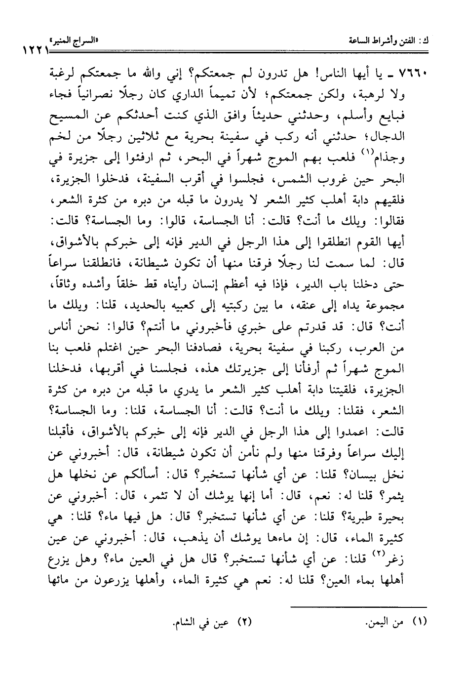 7660 - يا أيها الناس! هل تدرون لم جمعتكم؟ إني واللَّه ما جمعتكم لرغبة ولا لرهبة، ولكن جمعتكم؛ لأن تميمًا الداري كان رجلًا نصرانيًا فجاء فبايع وأسلم، وحدثني حديثًا وافق الذي كنت أحدثكم عن المسيح الدجال؛ حدثني أنه ركب في سفينة بحرية مع ثلاثين رجلًا من لخم وجذام (¬1) فلعب بهم الموج شهرًا في البحر، ثم ارفئوا إلى جزيرة في البحر حين غروب الشمس، فجلسوا في أقرب السفينة، فدخلوا الجزيرة، فلقيهم دابة أهلب كثير الشعر لا يدرون ما قبله من دبره من كثرة الشعر، فقالوا: ويلك ما أنت؟ قالت: أنا الجساسة، قالوا: وما الجساسة؟ قالت: أيها القوم انطلقوا إلى هذا الرجل في الدير فإنه إلى خبركم بالأشواق، قال: لما سمت لنا رجلًا فرقنا منها أن تكون شيطانة، فانطلقنا سراعًا حتى دخلنا باب الدير، فإذا فيه أعظم إنسان رأيناه قط خلقًا وأشده وثاقًا، مجموعة يداه إلى عنقه، ما بين ركبتيه إلى كعبيه بالحديد، قلنا: ويلك ما أنت؟ قال: قد قدرتم على خبري فأخبروني ما أنتم؟ قالوا: نحن أناس من العرب، ركبنا في سفينة بحرية، فصادفنا البحر حين اغتلم فلعب بنا الموج شهرًا ثم أرفأنا إلى جزيرتك هذه، فجلسنا في أقربها، فدخلنا الجزيرة، فلقيتنا دابة أهلب كثير الشعر ما يدري ما قبله من دبره من كثرة الشعر، فقلنا: ويلك ما أنت؟ قالت: أنا الجساسة، قلنا: وما الجساسة؟ قالت: اعمدوا إلى هذا الرجل في الدير فإنه إلى خبركم بالأشواق، فأقبلنا إليك سراعًا وفرقنا منها ولم نأمن أن تكون شيطانة، قال: أخبروني عن نخل بيسان؟ قلنا: عن أي شأنها تستخبر؟ قال: أسألكم عن نخلها هل يثمر؟ قلنا له: نعم، قال: أما إنها يوشك أن لا تثمر، قال: أخبروني عن بحيرة طبرية؟ قلنا: عن أي شأنها تستخبر؟ قال: هل فيها ماء؟ قلنا: هي كثيرة الماء، قال: إن ماءها يوشك أن يذهب، قال: أخبروني عن عين زغر (¬2) قلنا: عن أي شأنها تستخبر؟ قال هل في العين ماء؟ وهل يزرع أهلها بماء العين؟ قلنا له: نعم هي كثيرة الماء، وأهلها يزرعون من مائها