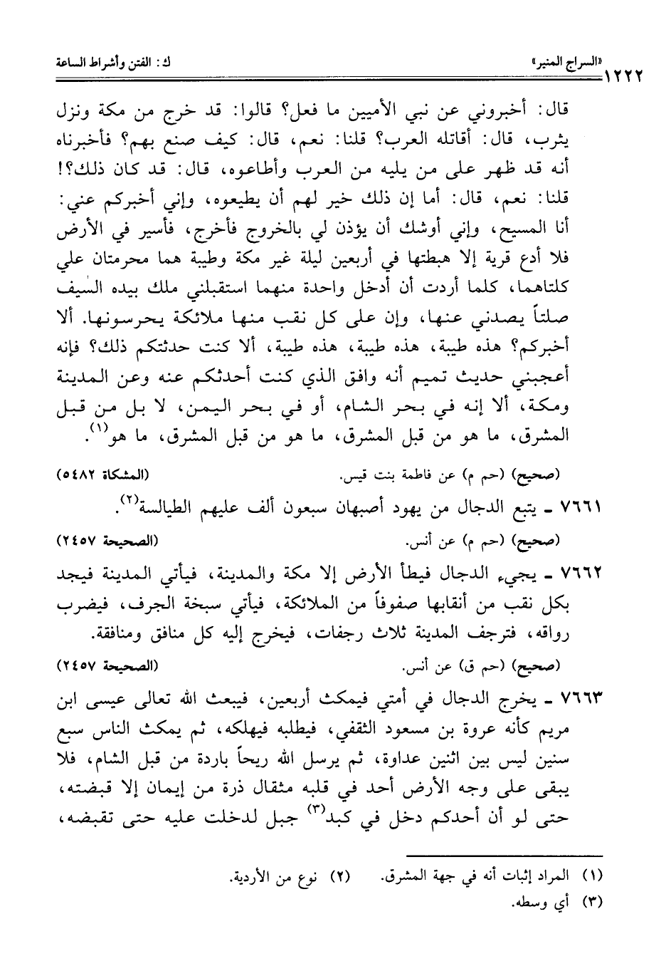 قال: أخبروني عن نبي الأميين ما فعل؟ قالوا: قد خرج من مكة ونزل يثرب، قال: أقاتله العرب؟ قلنا: نعم، قال: كيف صنع بهم؟ فأخبرناه أنه قد ظهر على من يليه من العرب وأطاعوه، قال: قد كان ذلك؟! قلنا: نعم، قال: أما إن ذلك خير لهم أن يطيعوه، وإني أخبركم عني: أنا المسيح، وإني أوشك أن يؤذن لي بالخروج فأخرج، فأسير في الأرض فلا أدع قرية إلا هبطتها في أربعين ليلة غير مكة وطيبة هما محرمتان علي كلتاهما، كلما أردت أن أدخل واحدة منهما استقبلني ملك بيده السيف صلتًا يصدني عنها، وإن على كل نقب منها ملائكة يحرسونها. ألا أخبركم؟ هذه طيبة، هذه طيبة، هذه طيبة، ألا كنت حدثتكم ذلك؟ فإنه أعجبني حديث تميم أنه وافق الذي كنت أحدثكم عنه وعن المدينة ومكة، ألا إنه في بحر الشام، أو في بحر اليمن، لا بل من قبل المشرق، ما هو من قبل المشرق، ما هو من قبل المشرق، ما هو (¬1).