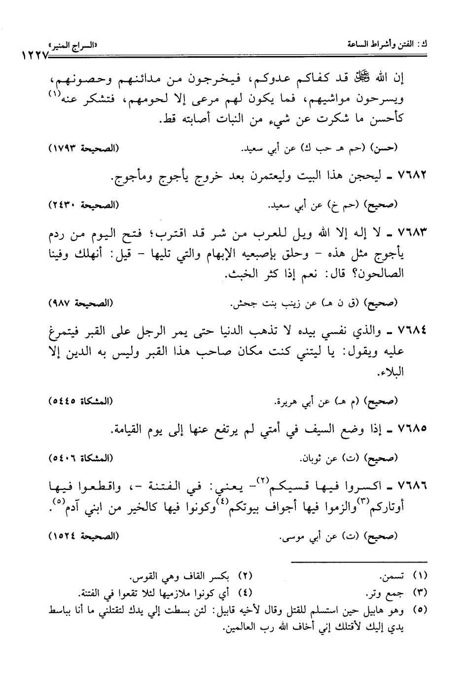 7686 - اكسروا فيها قسيكم (¬2) -يعني: في الفتنة-، واقطعوا فيها أوتاركم (¬3) والزموا فيها أجواف بيوتكم (¬4) وكونوا فيها كالخير من ابني آدم (¬5).