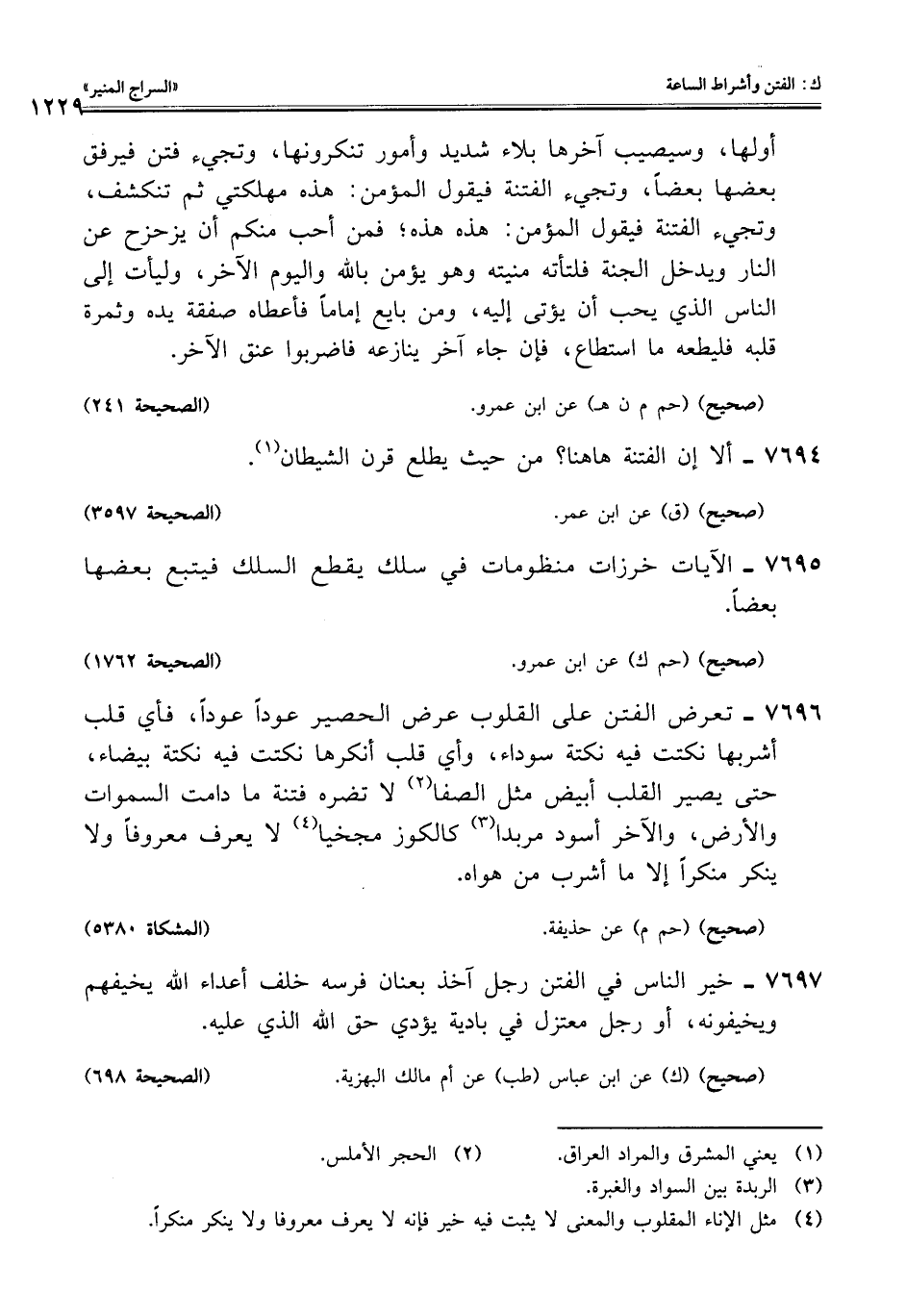 7696 - تعرض الفتن على القلوب عرض الحصير عودًا عودًا، فأي قلب أشربها نكتت فيه نكتة سوداء، وأي قلب أنكرها نكتت فيه نكتة بيضاء، حتى يصير القلب أبيض مثل الصفا (¬2) لا تضره فتنة ما دامت السموات والأرض، والآخر أسود مربدا (¬3) كالكوز مجخيا (¬4) لا يعرف معروفًا ولا ينكر منكرًا إلا ما أشرب من هواه.