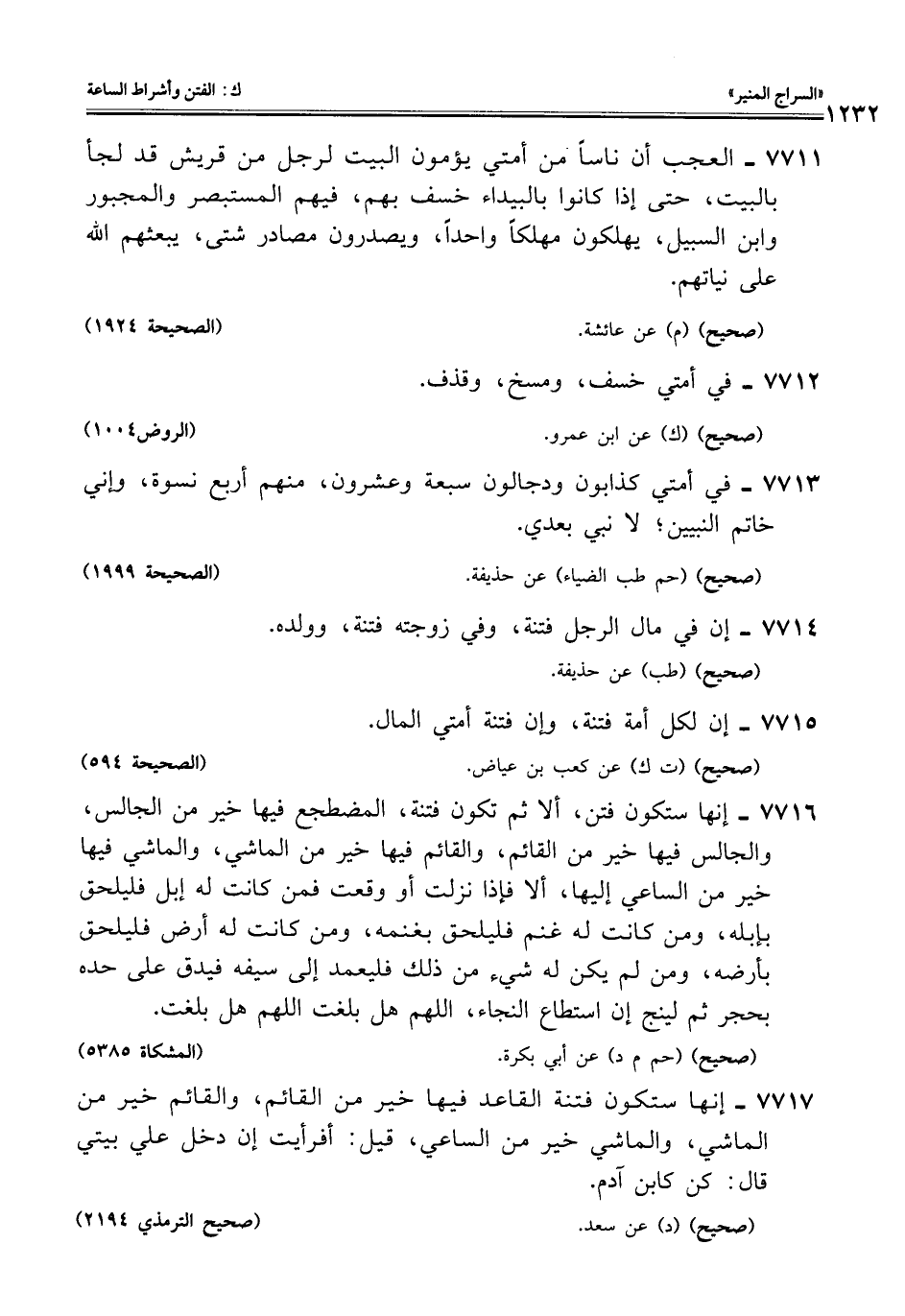 7717 - إنها ستكون فتنة القاعد فيها خير من القائم، والقائم خير من الماشي، والماشي خير من الساعي، قيل: أفرأيت إن دخل علي بيتي قال: كن كابن آدم.