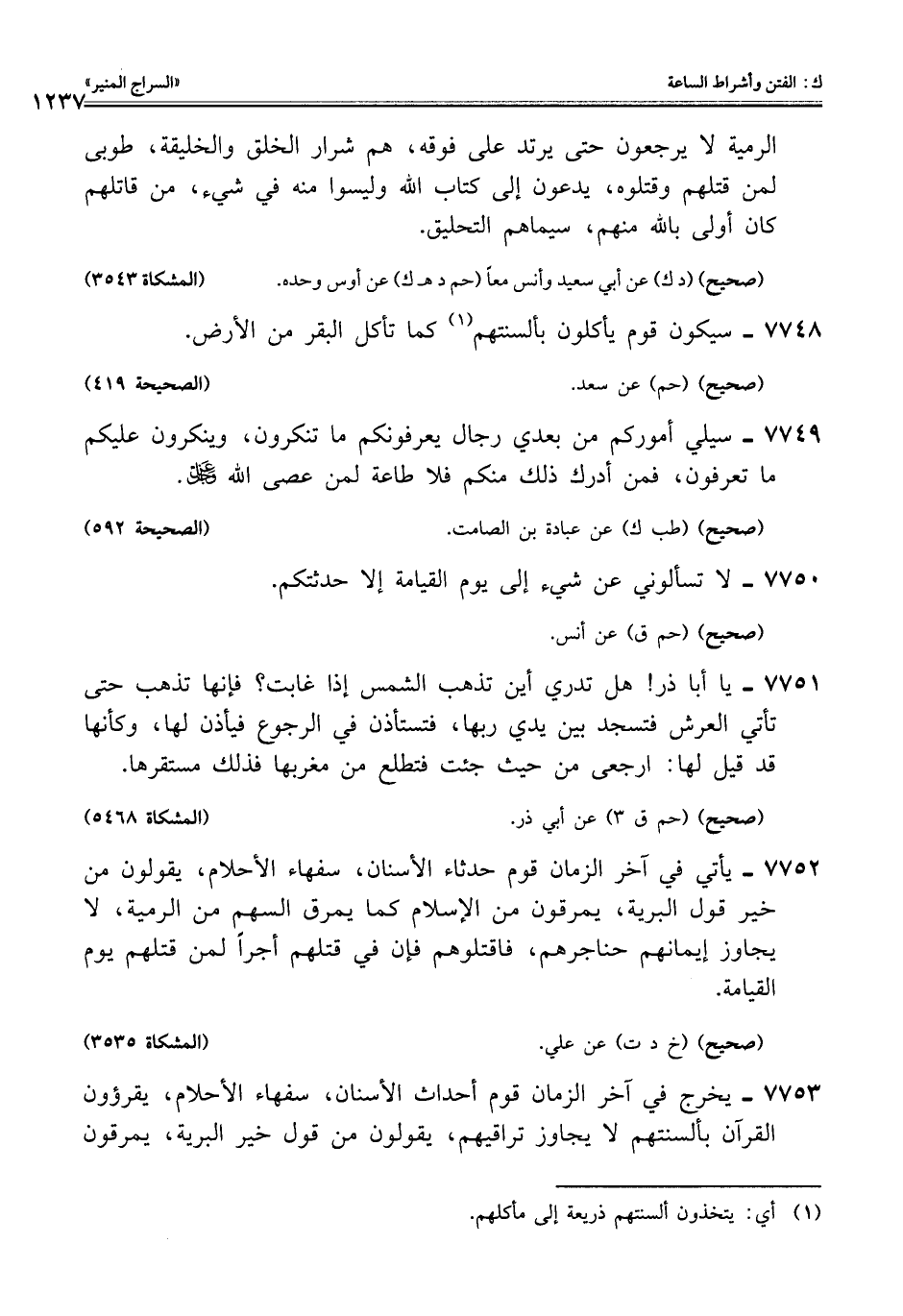7752 - يأتي في آخر الزمان قوم حدثاء الأسنان، سفهاء الأحلام، يقولون من خير قول البرية، يمرقون من الإسلام كما يمرق السهم من الرمية، لا يجاوز إيمانهم حناجرهم، فاقتلوهم فإن في قتلهم أجرًا لمن قتلهم يوم القيامة.