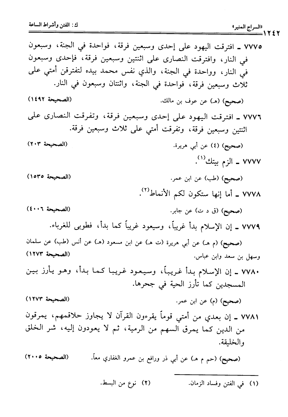 7776 - افترقت اليهود على إحدى وسبعين فرقة، وتفرقت النصارى على اثنتين وسبعين فرقة، وتفرقت أمتي على ثلاث وسبعين فرقة.