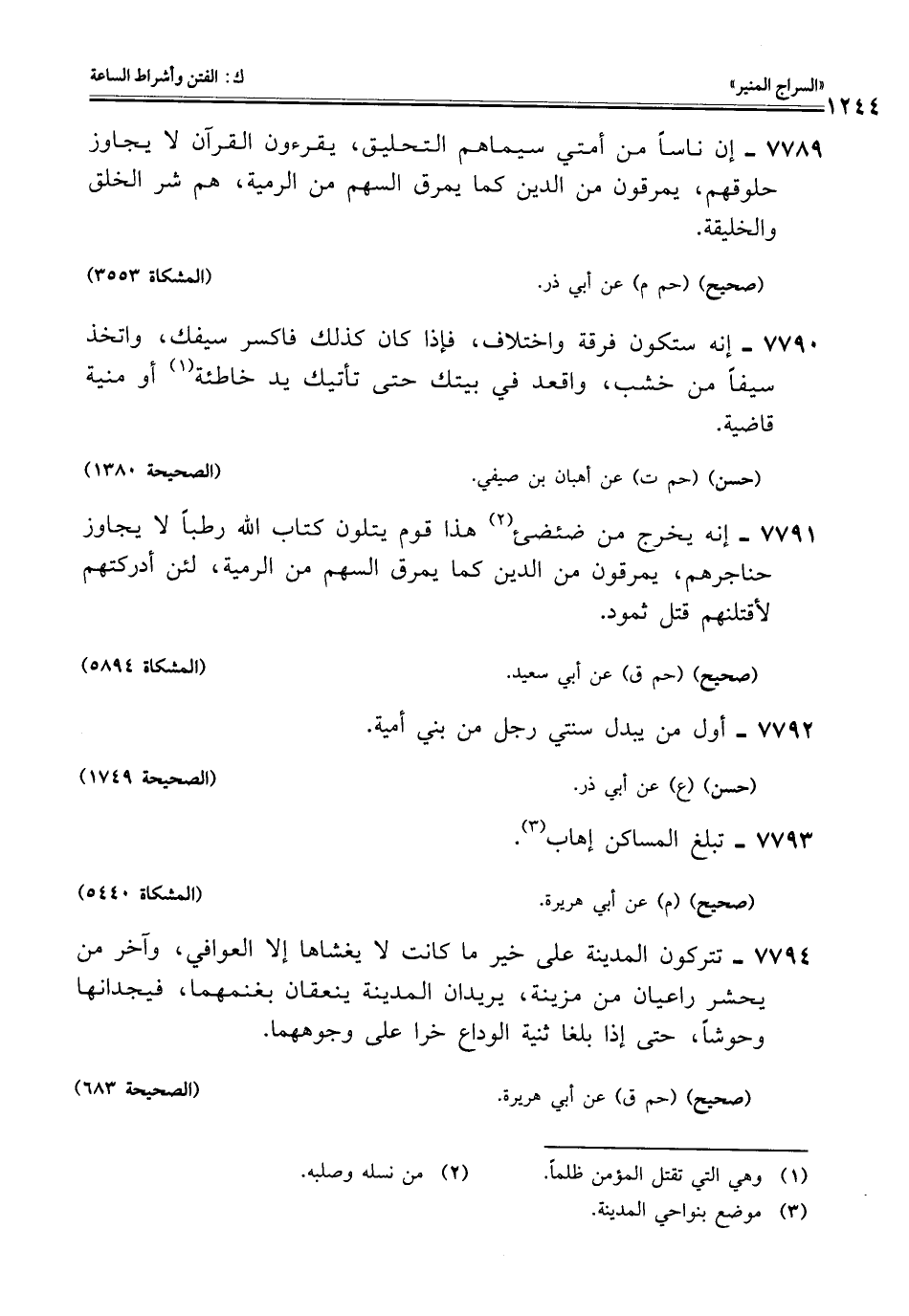7790 - إنه ستكون فرقة واختلاف، فإذا كان كذلك فاكسر سيفك، واتخذ سيفًا من خشب، واقعد في بيتك حتى تأتيك يد خاطئة (¬1) أو منية قاضية.