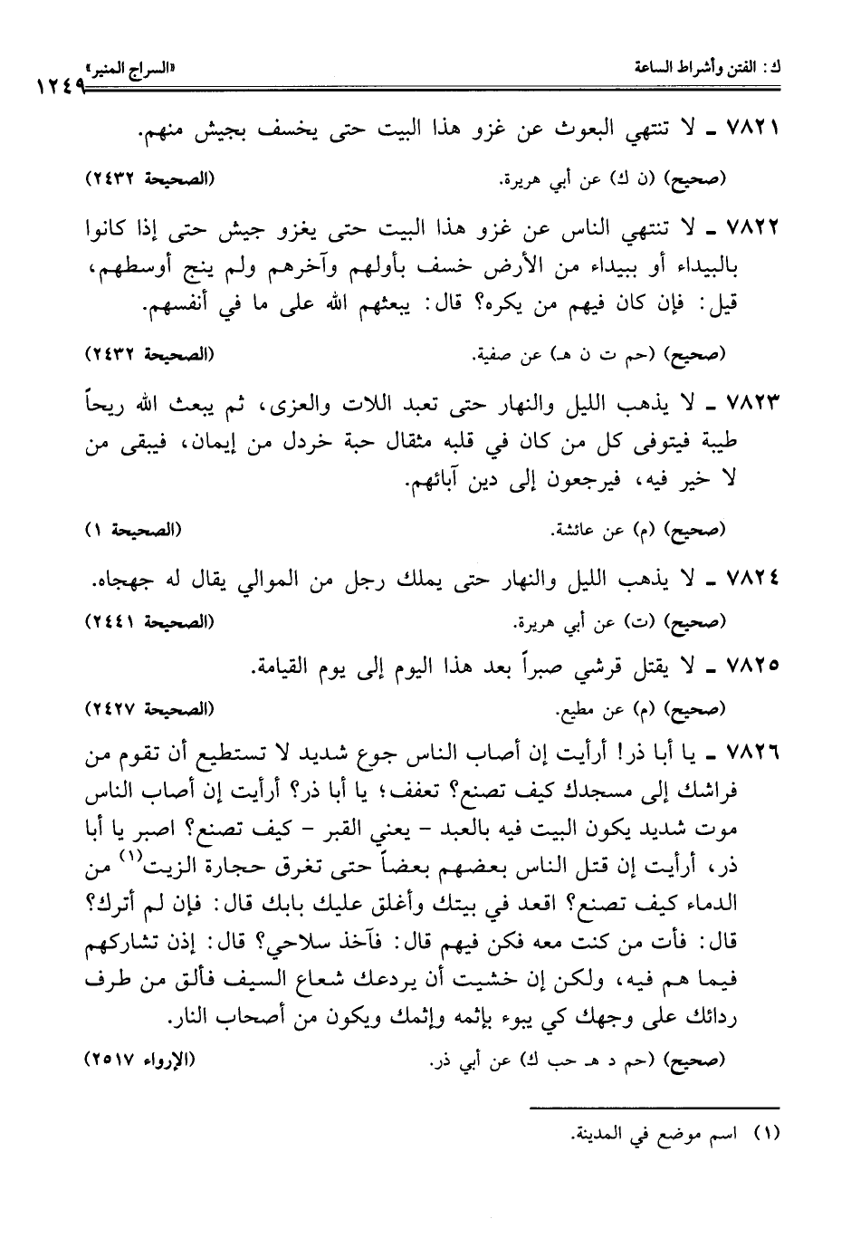 7822 - لا تنتهي الناس عن غزو هذا البيت حتى يغزو جيش حتى إذا كانوا بالبيداء أو ببيداء من الأرض خسف بأولهم وآخرهم ولم ينج أوسطهم، قيل: فإن كان فيهم من يكره؟ قال: يبعثهم اللَّه على ما في أنفسهم.
