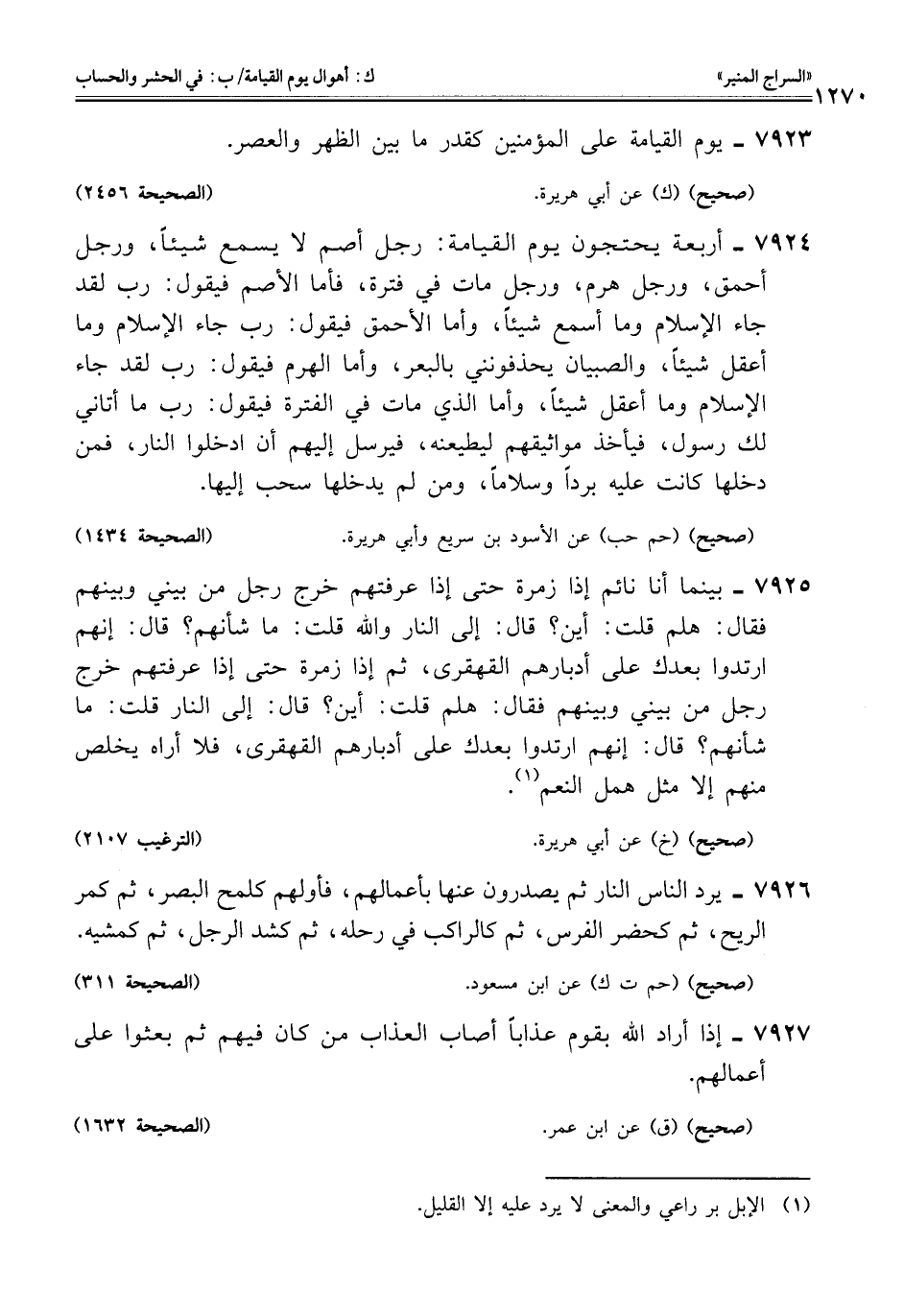 7924 - أربعة يحتجون يوم القيامة: رجل أصم لا يسمع شيئًا، ورجل أحمق، ورجل هرم، ورجل مات في فترة، فأما الأصم فيقول: رب لقد جاء الإسلام وما أسمع شيئًا، وأما الأحمق فيقول: رب جاء الإسلام وما أعقل شيئًا، والصبيان يحذفونني بالبعر، وأما الهرم فيقول: رب لقد جاء الإسلام وما أعقل شيئًا، وأما الذي مات في الفترة فيقول: رب ما أتاني لك رسول، فيأخذ مواثيقهم ليطيعنه، فيرسل إليهم أن ادخلوا النار، فمن دخلها كانت عليه بردًا وسلامًا، ومن لم يدخلها سحب إليها.
