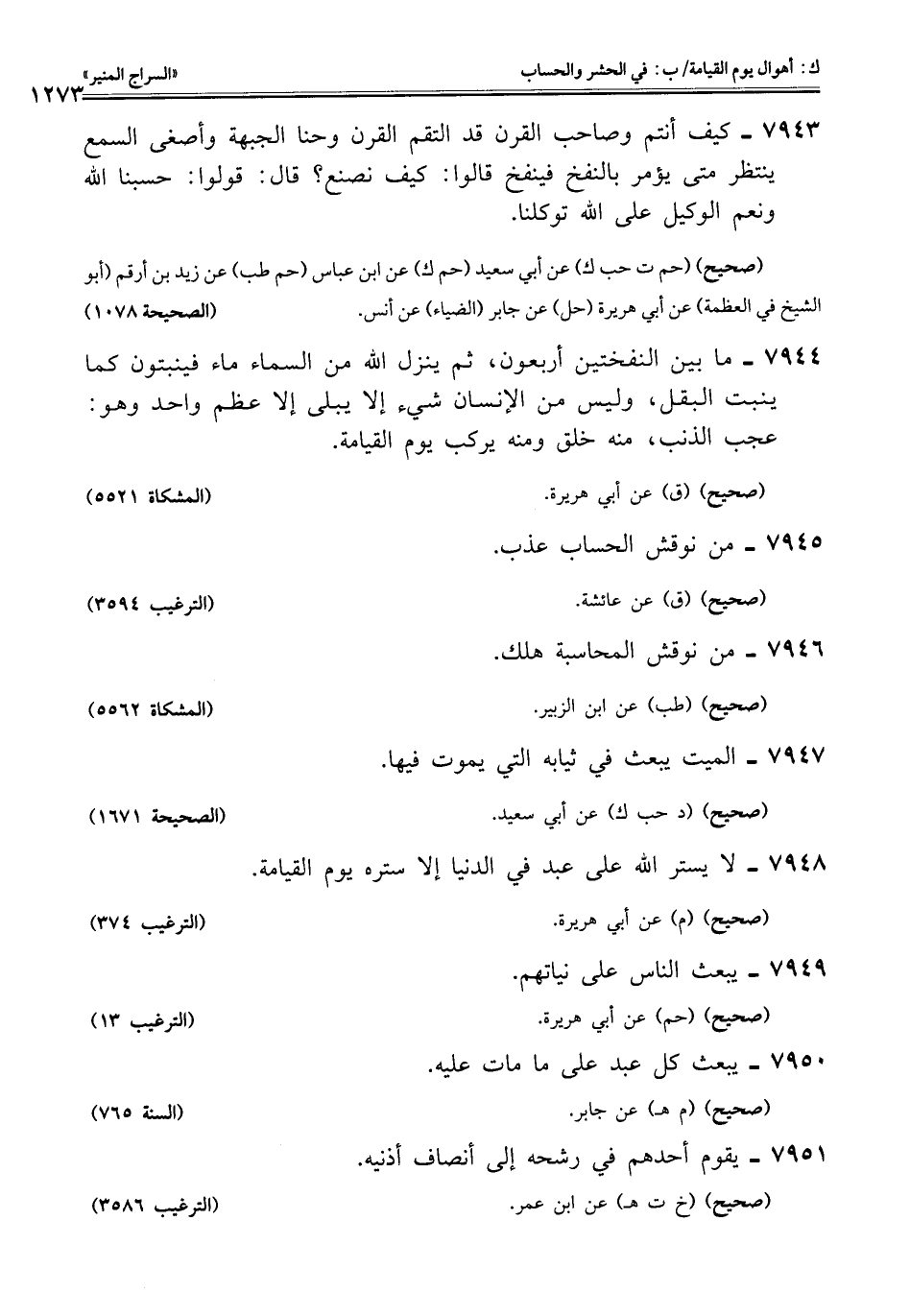 7943 - كيف أنتم وصاحب القرن قد التقم القرن وحنا الجبهة وأصغى السمع ينتظر متى يؤمر بالنفخ فينفخ قالوا: كيف نصنع؟ قال: قولوا: حسبنا اللَّه ونعم الوكيل على اللَّه توكلنا.