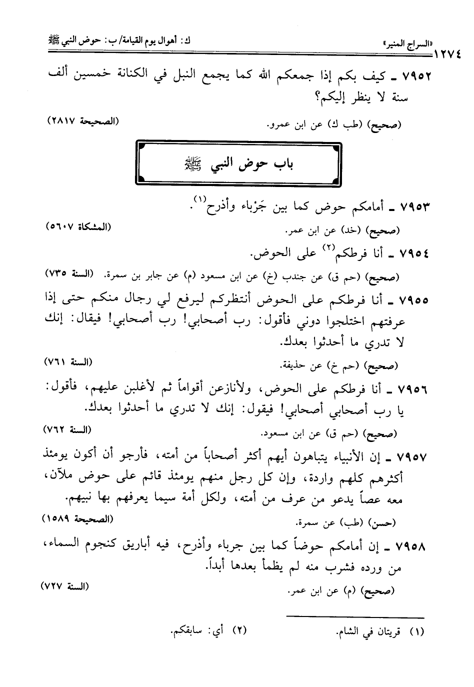 7958 - إن أمامكم حوضًا كما بين جرباء وأذرح، فيه أباريق كنجوم السماء، من ورده فشرب منه لم يظمأ بعدها أبدًا.