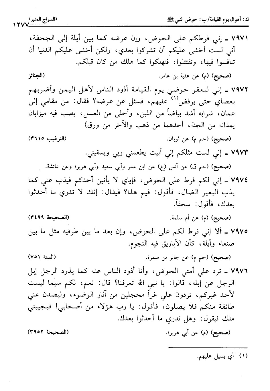 7975 - ألا إني فرط لكم على الحوض، وإن بعد ما بين طرفيه مثل ما بين صنعاء وأيلة، كأن الأباريق فيه النجوم.