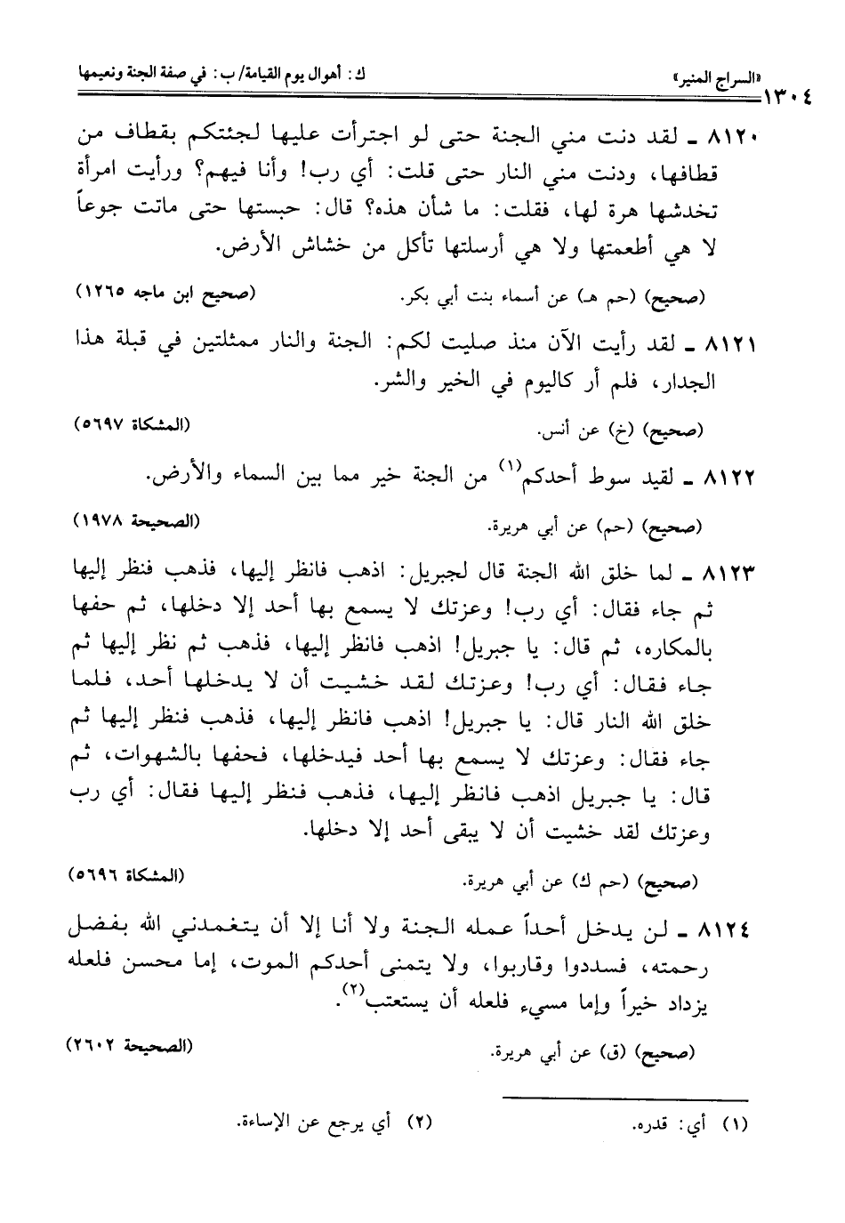 8124 - لن يدخل أحدًا عمله الجنة ولا أنا إلا أن يتغمدني اللَّه بفضل رحمته، فسددوا وقاربوا، ولا يتمنى أحدكم الموت، إما محسن فلعله يزداد خيرًا وإما مسيء فلعله أن يستعتب (¬2).