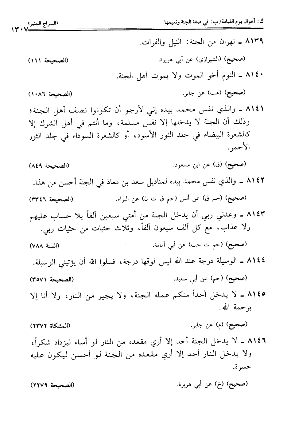 8146 - لا يدخل الجنة أحد إلا أري مقعده من النار لو أساء ليزداد شكرًا، ولا يدخل النار أحد إلا أري مقعده من الجنة لو أحسن ليكون عليه حسرة.