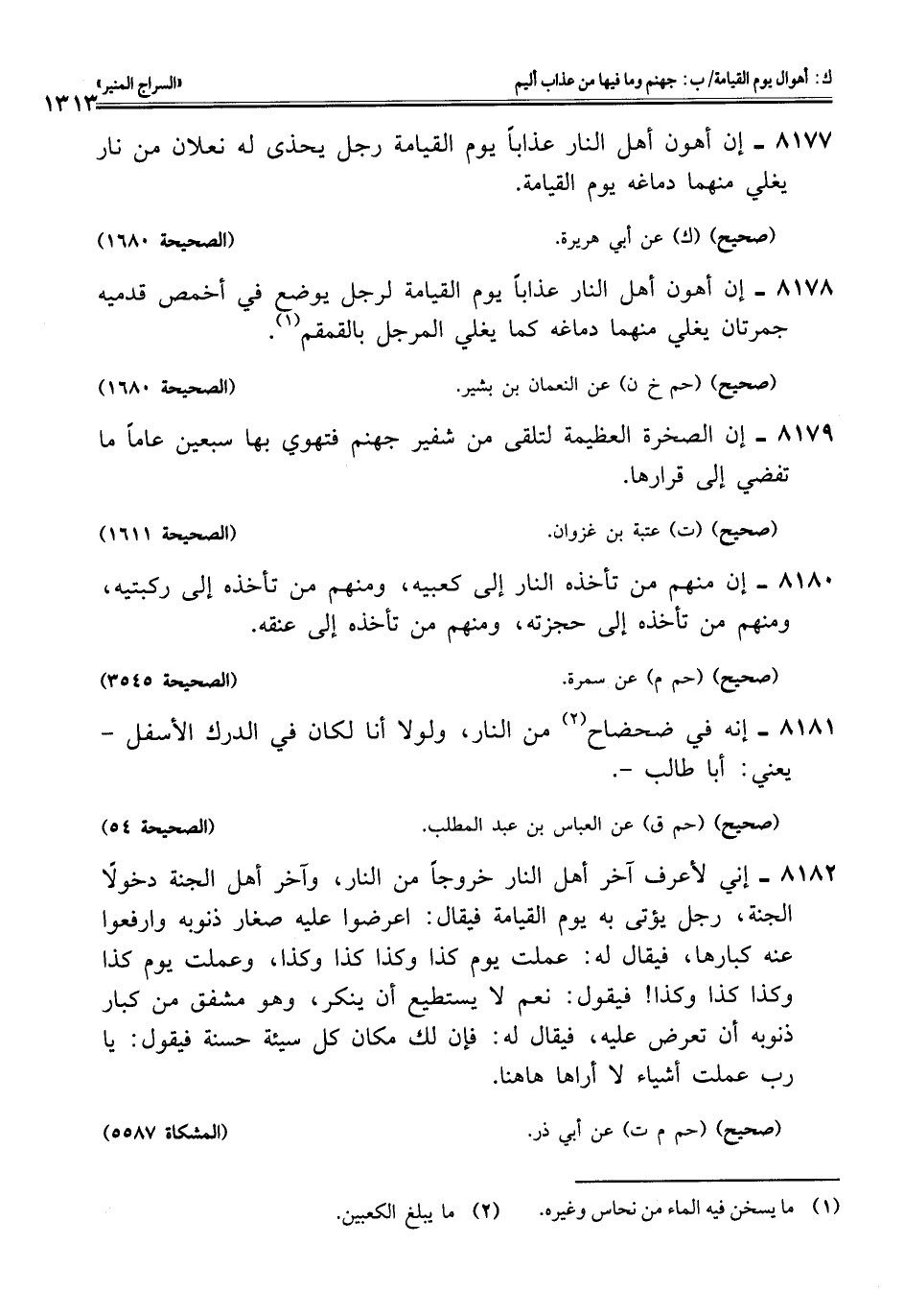 8178 - إن أهون أهل النار عذابًا يوم القيامة لرجل يوضع في أخمص قدميه جمرتان يغلي منهما دماغه كما يغلي المرجل بالقمقم (¬1).
