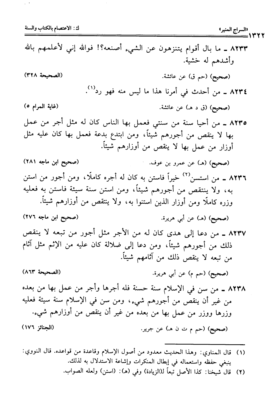 8235 - من أحيا سنة من سنتي فعمل بها الناس كان له مثل أجر من عمل بها لا ينقص من أجورهم شيئًا، ومن ابتدع بدعة فعمل بها كان عليه مثل أوزار من عمل بها لا ينقص من أوزارهم شيئًا.