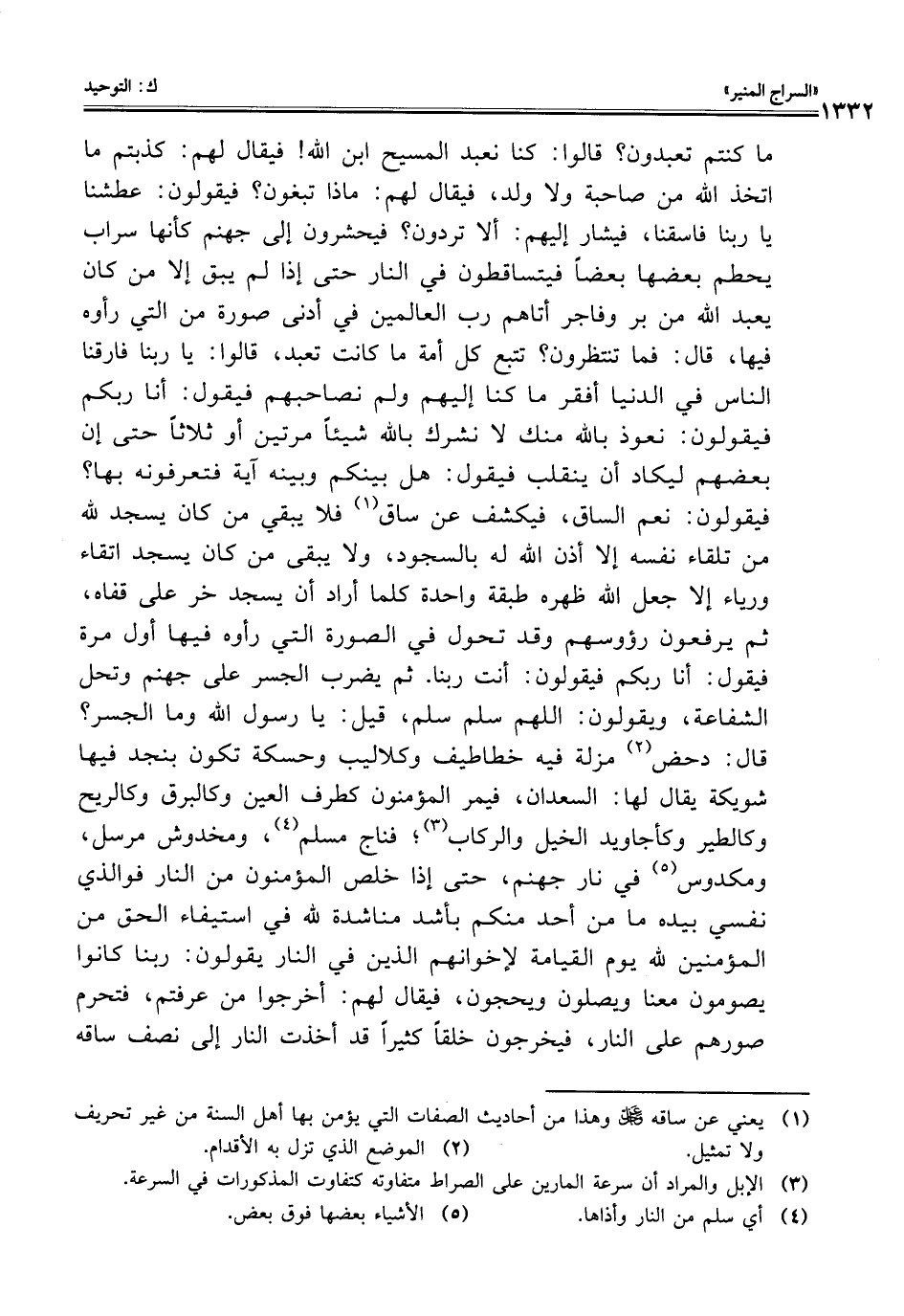 ما كنتم تعبدون؟ قالوا: كنا نعبد المسيح ابن اللَّه! فيقال لهم: كذبتم ما اتخذ اللَّه من صاحبة ولا ولد، فيقال لهم: ماذا تبغون؟ فيقولون: عطشنا يا ربنا فاسقنا، فيشار إليهم: ألا تردون؟ فيحشرون إلى جهنم كأنها سراب يحطم بعضها بعضًا فيتساقطون في النار حتى إذا لم يبق إلا من كان يعبد اللَّه من بر وفاجر أتاهم رب العالمين في أدنى صورة من التي رأوه فيها، قال: فما تنتظرون؟ تتبع كل أمة ما كانت تعبد، قالوا: يا ربنا فارقنا الناس في الدنيا أفقر ما كنا إليهم ولم نصاحبهم فيقول: أنا ربكم فيقولون: نعوذ باللَّه منك لا نشرك باللَّه شيئًا مرتين أو ثلاثًا حتى إن بعضهم ليكاد أن ينقلب فيقول: هل بينكم وبينه آية فتعرفونه بها؟ فيقولون: نعم الساق، فيكشف عن ساق (¬1) فلا يبقي من كان يسجد للَّه من تلقاء نفسه إلا أذن اللَّه له بالسجود، ولا يبقى من كان يسجد اتقاء ورياء إلا جعل اللَّه ظهره طبقة واحدة كلما أراد أن يسجد خر على قفاه، ثم يرفعون رؤوسهم وقد تحول في الصورة التي رأوه فيها أول مرة فيقول: أنا ربكم فيقولون: أنت ربنا. ثم يضرب الجسر على جهنم وتحل الشفاعة، ويقولون: اللهم سلم سلم، قيل: يا رسول اللَّه وما الجسر؟ قال: دحض (¬2) مزلة فيه خطاطيف وكلاليب وحسكة تكون بنجد فيها شويكة يقال لها: السعدان، فيمر المؤمنون كطرف العين وكالبرق وكالريح وكالطير وكأجاويد الخيل والركاب (¬3)؛ فناج مسلم (¬4)، ومخدوش مرسل، ومكدوس (¬5) في نار جهنم، حتى إذا خلص المؤمنون من النار فوالذي نفسي بيده ما من أحد منكم بأشد مناشدة للَّه في استيفاء الحق من المؤمنين للَّه يوم القيامة لإخوانهم الذين في النار يقولون: ربنا كانوا يصومون معنا ويصلون ويحجون، فيقال لهم: أخرجوا من عرفتم، فتحرم صورهم على النار، فيخرجون خلقًا كثيرًا قد أخذت النار إلى نصف ساقه