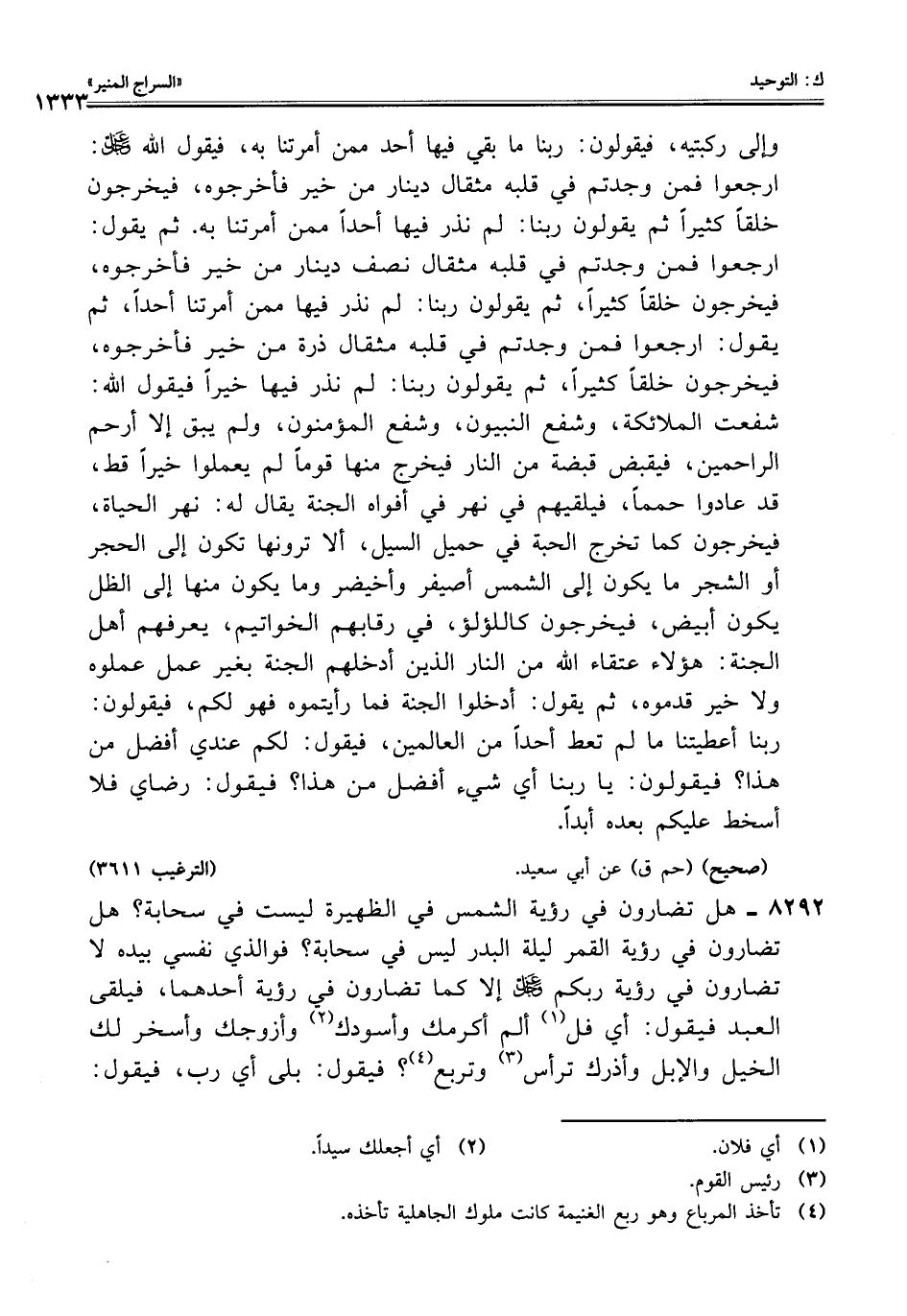 8292 - هل تضارون في رؤية الشمس في الظهيرة ليست في سحابة؟ هل تضارون في رؤية القمر ليلة البدر ليس في سحابة؟ فوالذي نفسي بيده لا تضارون في رؤية ربكم -عز وجل- إلا كما تضارون في رؤية أحدهما، فيلقى العبد فيقول: أي فل (¬1) ألم أكرمك وأسودك (¬2) وأزوجك وأسخر لك الخيل والإبل وأذرك ترأس (¬3) وتربع (¬4)؟ فيقول: بلى أي رب، فيقول: