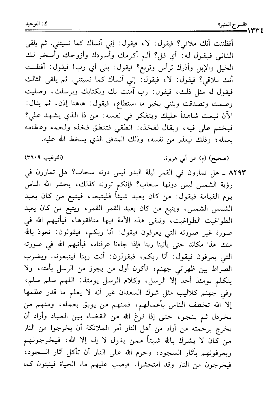 8293 - هل تمارون في القمر ليلة البدر ليس دونه سحاب؟ هل تمارون في رؤية الشمس ليس دونها سحاب؟ فإنكم ترونه كذلك، يحشر اللَّه الناس يوم القيامة فيقول: من كان يعبد شيئًا فليتبعه، فيتبع من كان يعبد الشمس الشمس، ويتبع من كان يعبد القمر القمر، ويتبع من كان يعبد الطواغيت الطواغيت، وتبقى هذه الأمة فيها منافقوها، فيأتيهم اللَّه في صورة غير صورته التي يعرفون فيقول: أنا ربكم، فيقولون: نعوذ باللَّه منك هذا مكاننا حتى يأتينا ربنا فإذا جاءنا عرفناه، فيأتيهم اللَّه في صورته التي يعرفون فيقول: أنا ربكم، فيقولون: أنت ربنا فيتبعونه. ويضرب الصراط بين ظهراني جهنم، فأكون أول من يجوز من الرسل بأمته، ولا يتكلم يومئذ أحد إلا الرسل، وكلام الرسل يومئذ: اللهم سلم سلم، وفي جهنم كلاليب مثل شوك السعدان غير أنه لا يعلم ما قدر عظمها إلا اللَّه تخطف الناس بأعمالهم، فمنهم من يوبق بعمله، ومنهم من يخردل ثم ينجو، حتى إذا فرغ اللَّه من القضاء بين العباد وأراد أن يخرج برحمته من أراد من أهل النار أمر الملائكة أن يخرجوا من النار من كان لا يشرك باللَّه شيئًا ممن يقول لا إله إلا اللَّه، فيخرجونهم ويعرفونهم بآثار السجود، وحرم اللَّه على النار أن تأكل آثار السجود، فيخرجون من النار وقد امتحشوا، فيصب عليهم ماء الحياة فينبتون كما