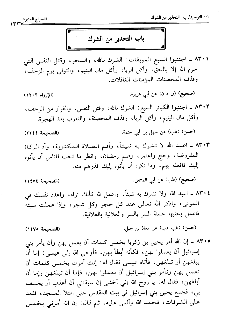 8302 - اجتنبوا الكبائر السبع: الشرك باللَّه، وقتل النفس، والفرار من الزحف، وأكل مال اليتيم، وأكل الربا، وقذف المحصنة، والتعرب بعد الهجرة.
