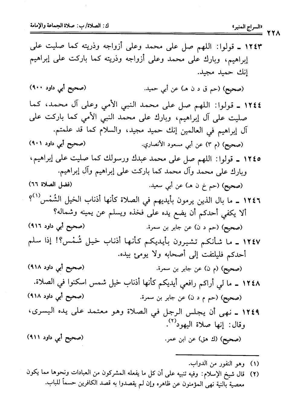 1246 - ما بال الذين يرمون بأيديهم في الصلاة كأنها أذناب الخيل الشُمْس (¬1)؟ ألا يكفي أحدكم أن يضع يده على فخذه ويسلم عن يمينه وشماله؟