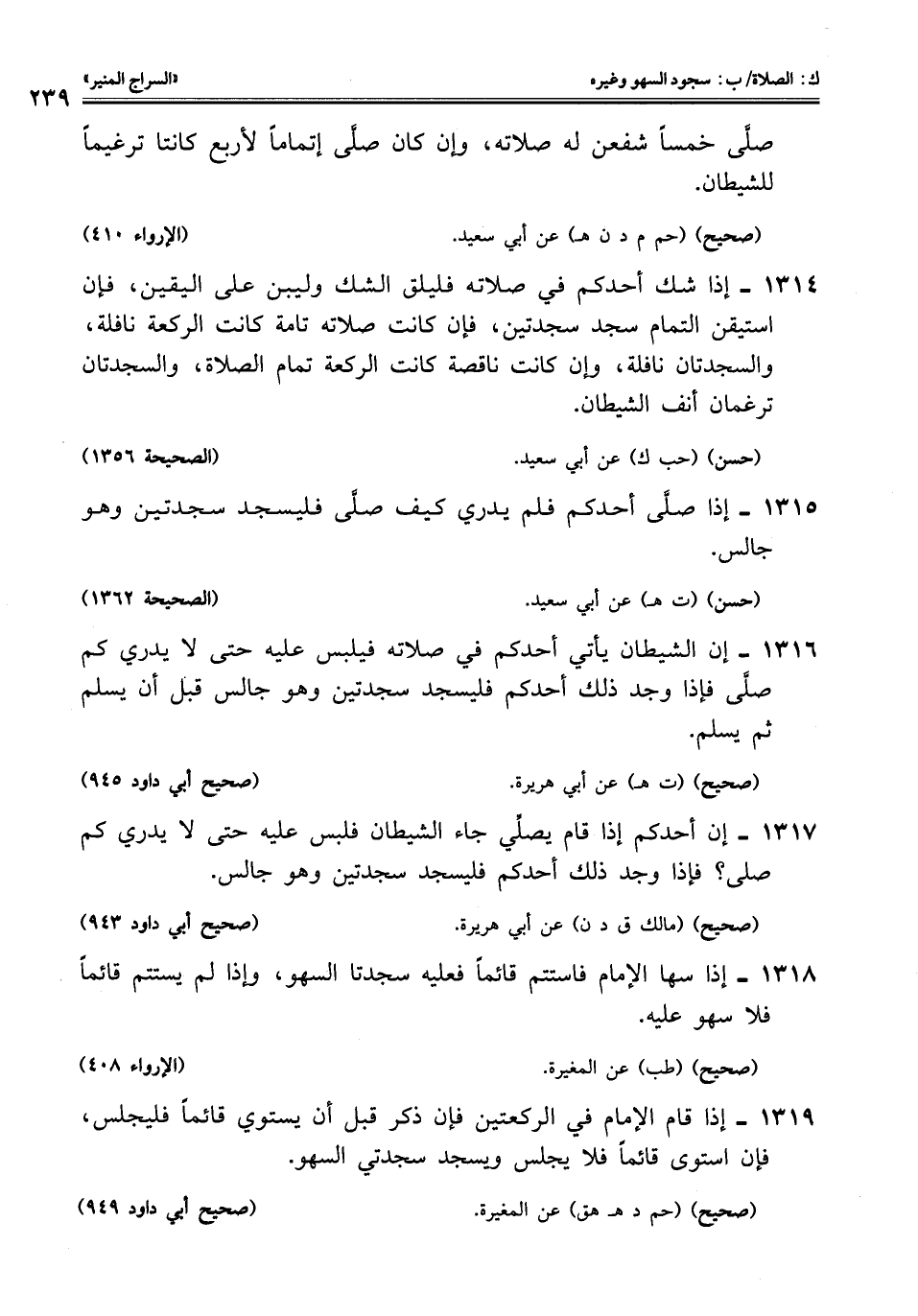 1319 - إذا قام الإمام في الركعتين فإن ذكر قبل أن يستوي قائمًا فليجلس، فإن استوى قائمًا فلا يجلس ويسجد سجدتي السهو.