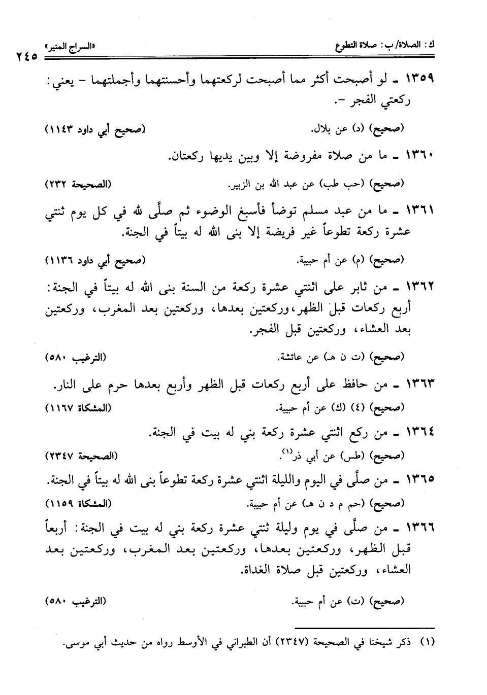 1362 - من ثابر على اثنتي عشرة ركعة من السنة بنى اللَّه له بيتًا فى الجنة: أربع ركعات قبل الظهر، وركعتين بعدها، وركعتين بعد المغرب، وركعتين بعد العشاء، وركعتين قبل الفجر.