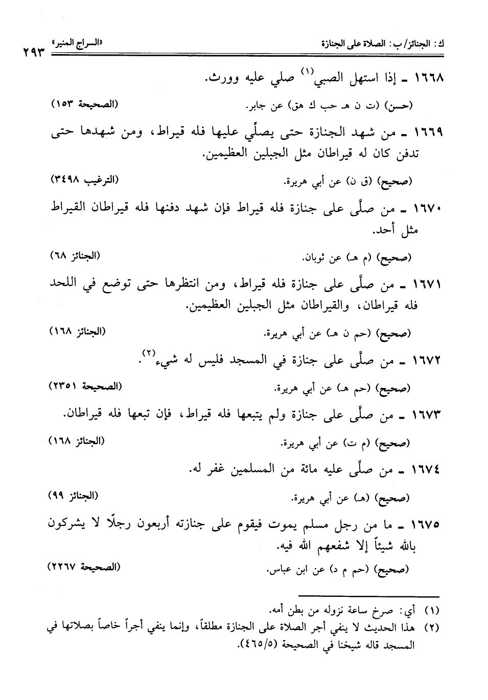 (¬2) هذا الحديث لا ينفي أجر الصلاة على الجنازة مطلقًا، وانما ينفي أجرًا خاصًا بصلاتها في المسجد قاله شيخنا في الصحيحة (5/ 465).