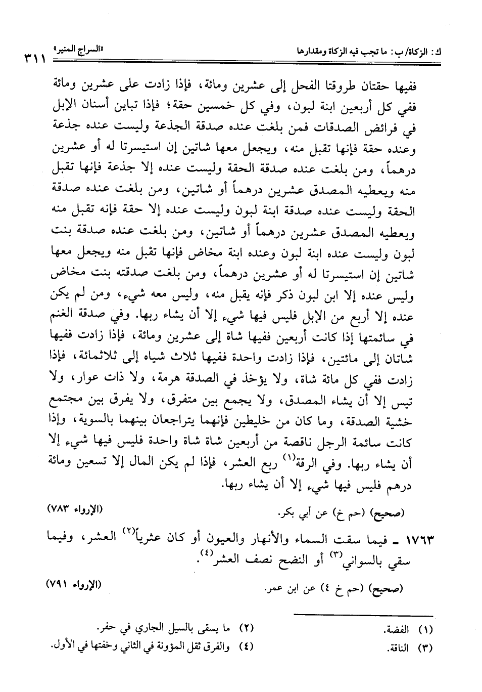 1763 - فيما سقت السماء والأنهار والعيون أو كان عثريًا (¬2) العشر، وفيما سقي بالسواني (¬3) أو النضح نصف العشر (¬4).