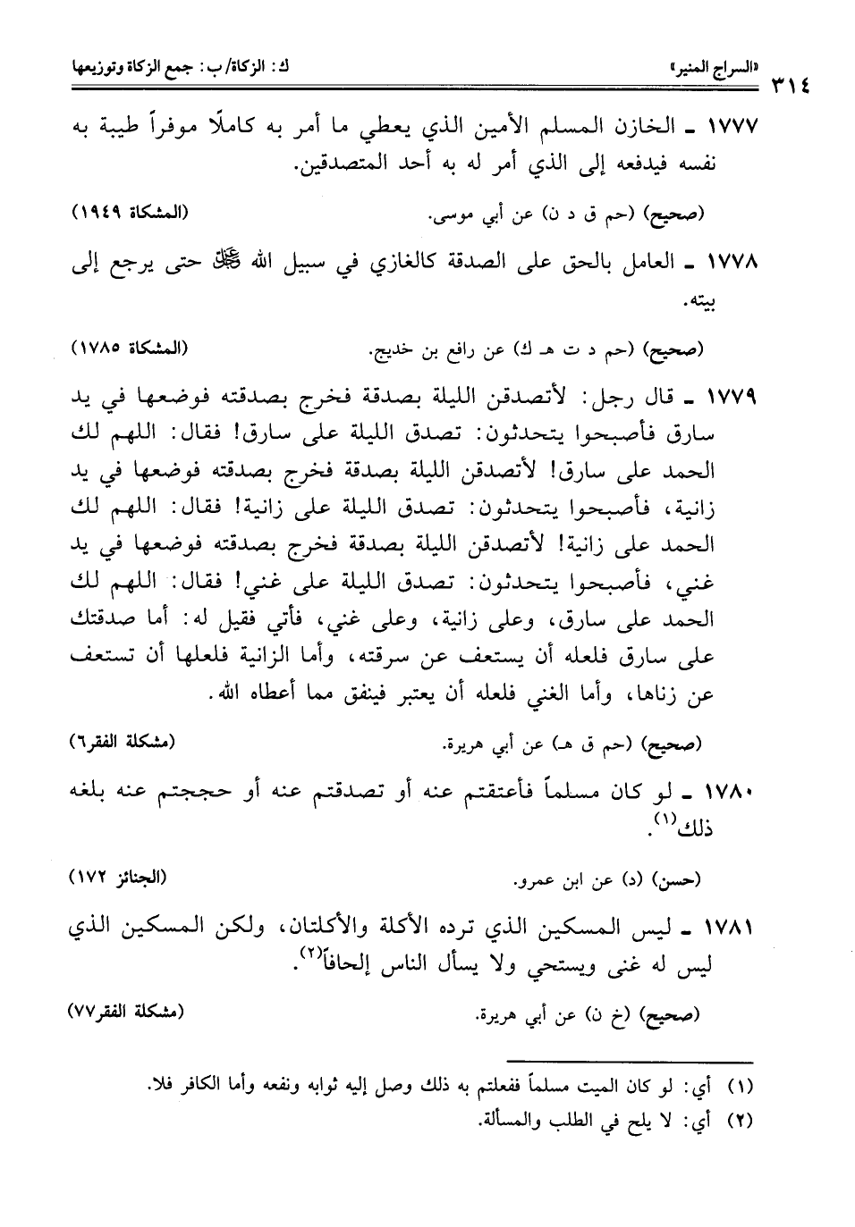 1779 - قال رجل: لأتصدقن الليلة بصدقة فخرج بصدقته فوضعها في يد سارق فأصبحوا يتحدثون: تصدق الليلة على سارق! فقال: اللهم لك الحمد على سارق! لأتصدقن الليلة بصدقة فخرج بصدقته فوضعها في يد زانية، فأصبحوا يتحدثون: تصدق الليلة على زانية! فقال: اللهم لك الحمد على زانية! لأتصدقن الليلة بصدقة فخرج بصدقته فوضعها في يد غني، فأصبحوا يتحدثون: تصدق الليلة على غني! فقال: اللهم لك الحمد على سارق، وعلى زانية، وعلى غني، فأتي فقيل له: أما صدقتك على سارق فلعله أن يستعف عن سرقته، وأما الزانية فلعلها أن تستعف عن زناها، وأما الغني فلعله أن يعتبر فينفق مما أعطاه اللَّه.