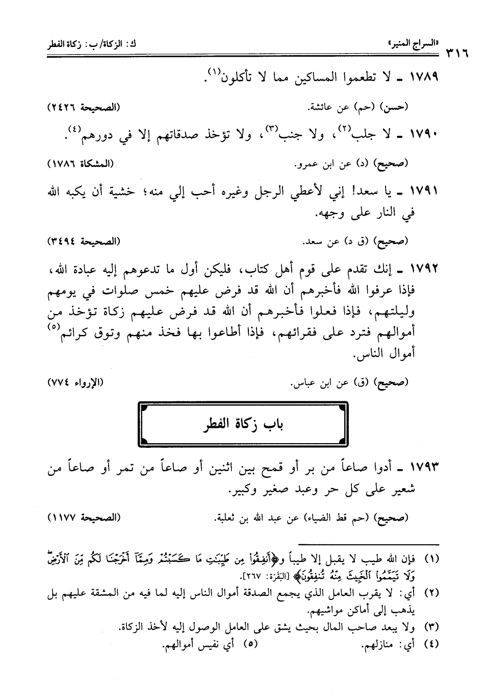 1793 - أدوا صاعًا من بر أو قمح بين اثنين أو صاعًا من تمر أو صاعًا من شعير على كل حر وعبد صغير وكبير.