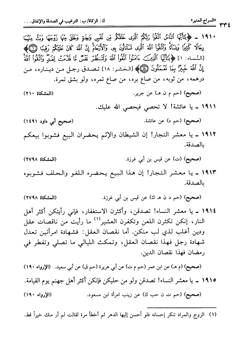 1914 - يا معشر النساء! تصدقن، وأكثرن الاستغفار، فإني رأيتكن أكثر أهل النار، إنكن تكثرن اللعن وتكفرن العشير (¬1) ما رأيت من ناقصات عقل ودين أغلب لذي لب منكن. أما نقصان العقل: فشهادة امرأتين تعدل شهادة رجل فهذا نقصان العقل، وتمكث الليالي ما تصلي وتفطر في رمضان فهذا نقصان الدين.