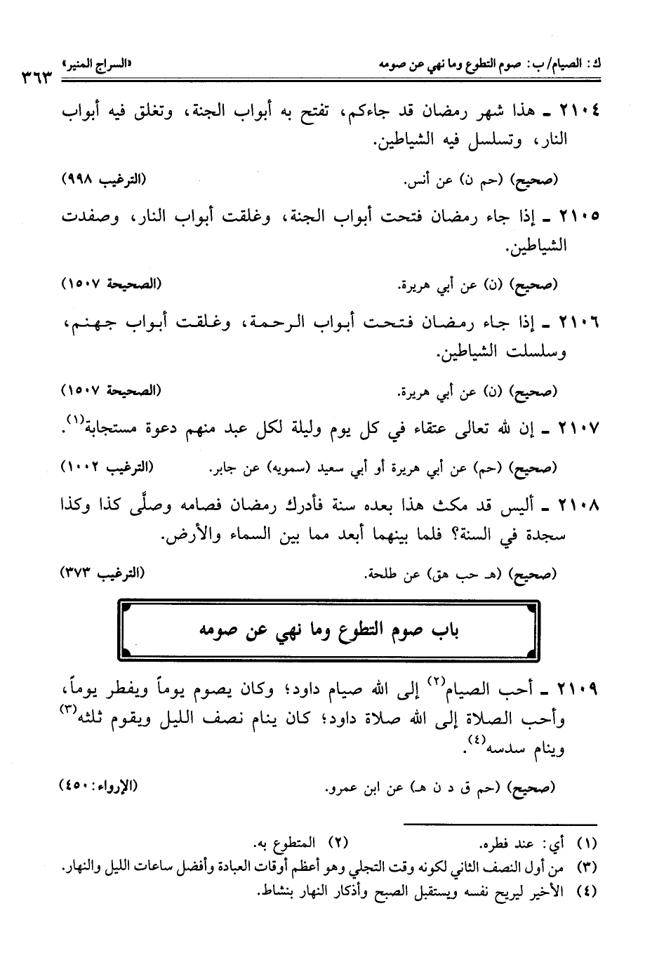 2109 - أحب الصيام (¬2) إلى اللَّه صيام داود؛ وكان يصوم يومًا ويفطر يومًا، وأحب الصلاة إلى اللَّه صلاة داود؛ كان ينام نصف الليل ويقوم ثلثه (¬3) وينام سدسه (¬4).