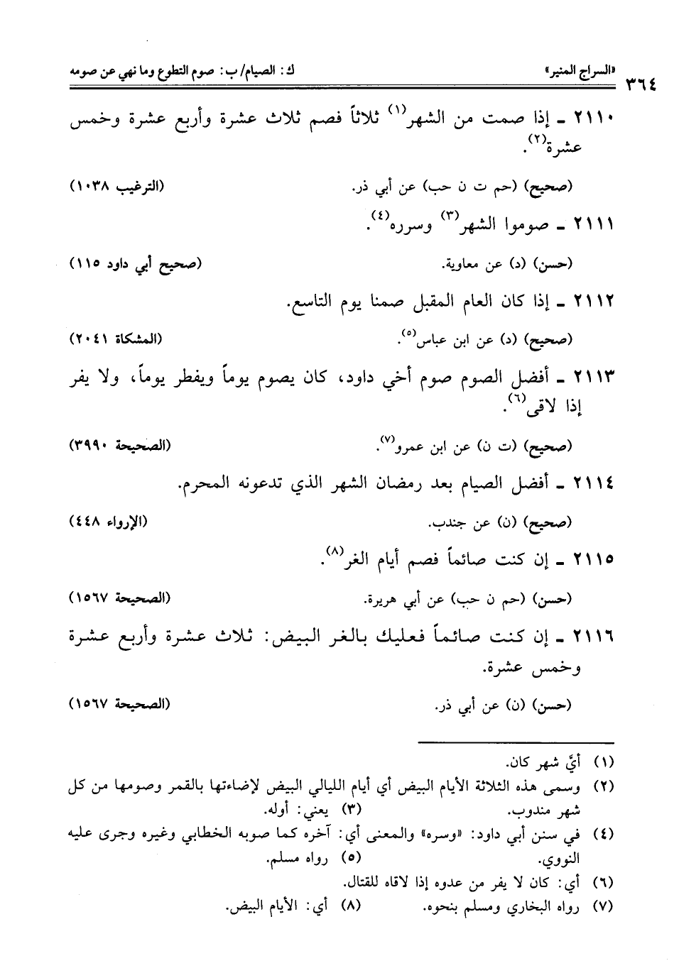 (¬2) وسمى هذه الثلاثة الأيام البيض أي أيام الليالي البيض لإضاءتها بالقمر وصومها من كل شهر مندوب.