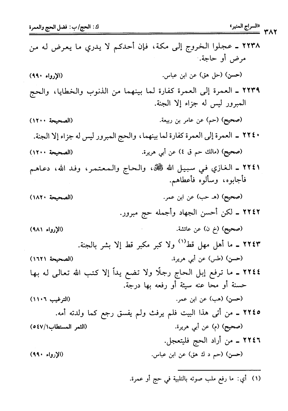 2238 - عجلوا الخروج إلى مكة، فإن أحدكم لا يدري ما يعرض له من مرض أو حاجة. .
