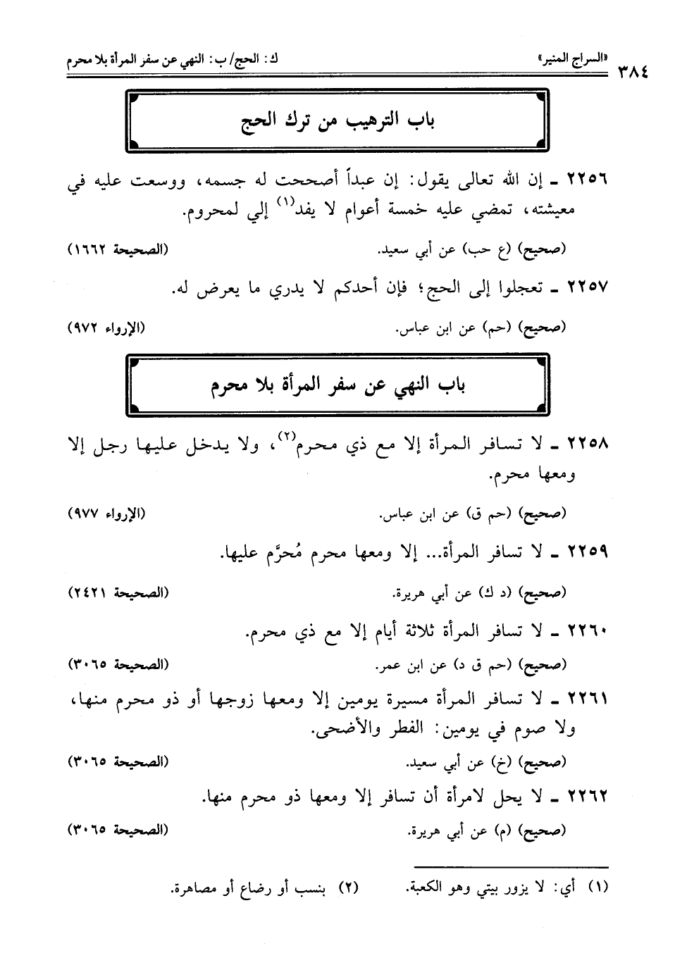 2258 - لا تسافر المرأة إلا مع ذي محرم (¬2)، ولا يدخل عليها رجل إلا ومعها محرم.