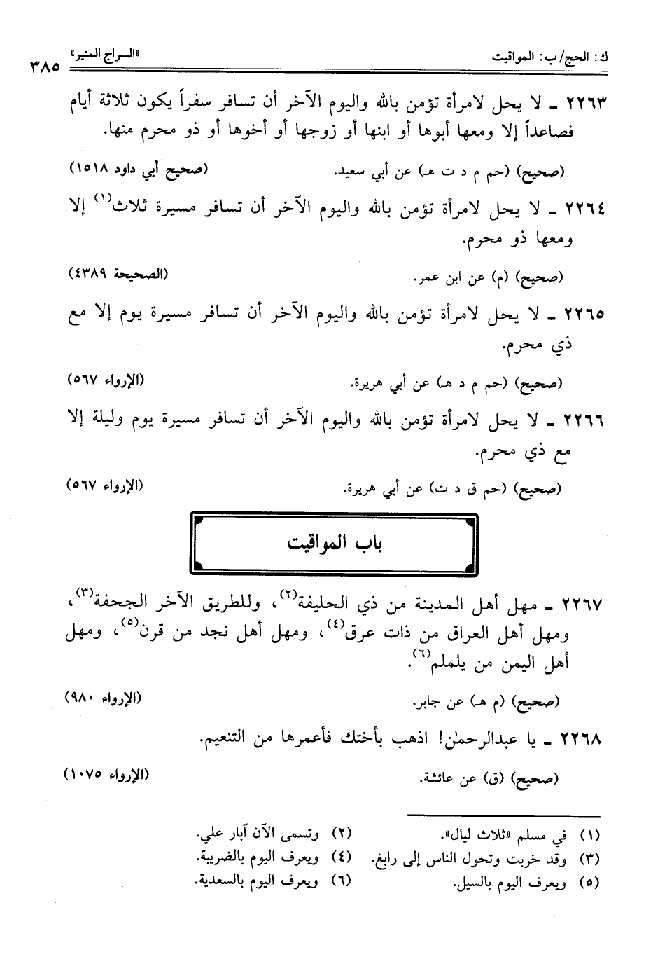 2265 - لا يحل لامرأة تؤمن باللَّه واليوم الآخر أن تسافر مسيرة يوم إلا مع ذي محرم.