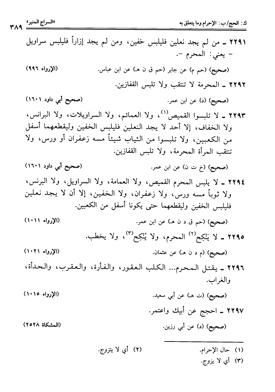 2294 - لا يلبس المحرم القميص، ولا العمامة، ولا السراويل، ولا البرنس، ولا ثوبًا مسه ورس، ولا زعفران، ولا الخفين، إلا أن لا يجد نعلين فليلبس الخفين وليقطعهما حتى يكونا أسفل من الكعبين.