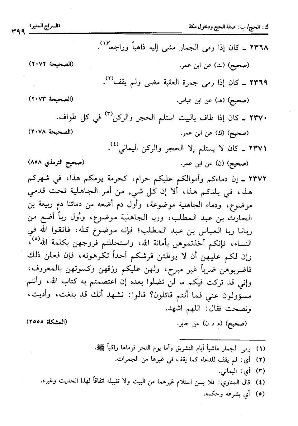 2372 - إن دماءكم وأموالكم عليكم حرام، كحرمة يومكم هذا، في شهركم هذا، في بلدكم هذا، ألا إن كل شيء من أمر الجاهلية تحت قدمي موضوع، ودماء الجاهلية موضوعة، وأول دم أضعه من دمائنا دم ربيعة بن الحارث بن عبد المطلب، وربا الجاهلية موضوع، وأول ربًا أضع من ربانا ربا العباس بن عبد المطلب؛ فإنه موضوع كله، فاتقوا اللَّه في النساء، فإنكم أخذتموهن بأمانة اللَّه، واستحللتم فروجهن بكلمة اللَّه (¬5)، وإن لكم عليهن أن لا يوطئن فرشكم أحدًا تكرهونه، فإن فعلن ذلك فاضربوهن ضربًا غير مبرح، ولهن عليكم رزقهن وكسوتهن بالمعروف، وإني قد تركت فيكم ما لن تضلوا بعده إن اعتصمتم به كتاب اللَّه، وأنتم مسؤولون عني فما أنتم قائلون؟ قالوا: نشهوإنك قد بلغت، وأديت، ونصحت فقال: اللهم اشهد.