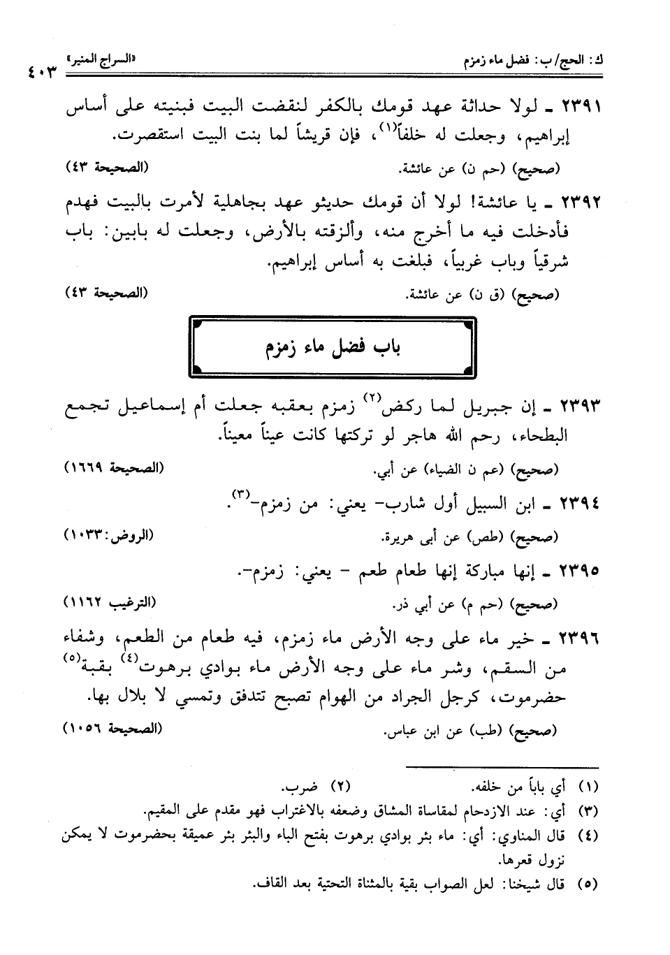 2396 - خير ماء على وجه الأرض ماء زمزم، فيه طعام من الطعم، وشفاء من السقم، وشر ماء على وجه الأرض ماء بوادي برهوت (¬4) بقبة (¬5) حضرموت، كرجل الجراد من الهوام تصبح تتدفق وتمسي لا بلال بها.