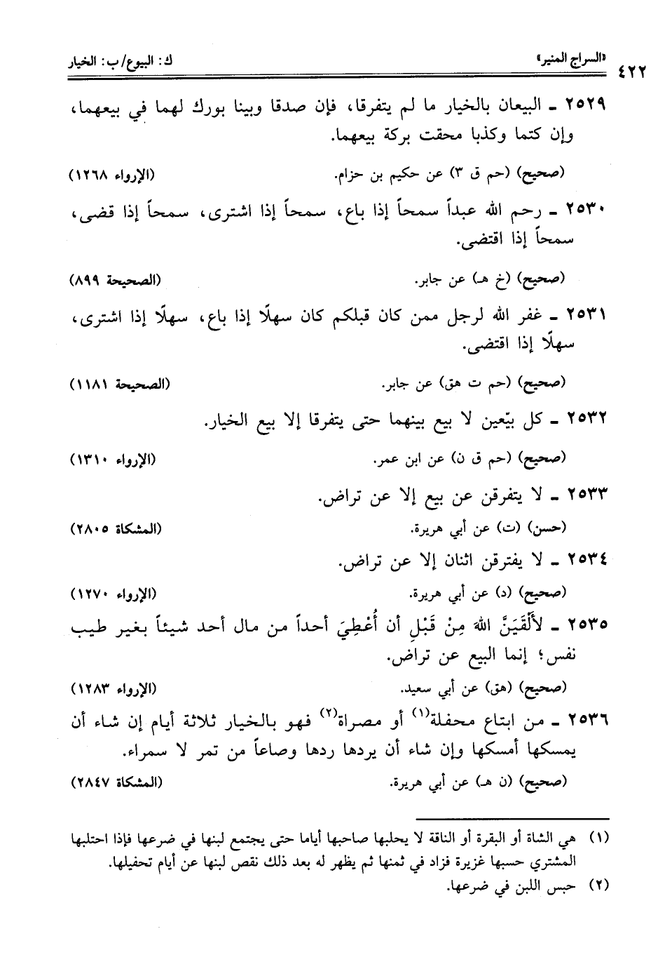 2536 - من ابتاع محفلة (¬1) أو مصراة (¬2) فهو بالخيار ثلاثة أيام إن شاء أن يمسكها أمسكها وإن شاء أن يردها ردها وصاعًا من تمر لا سمراء.
