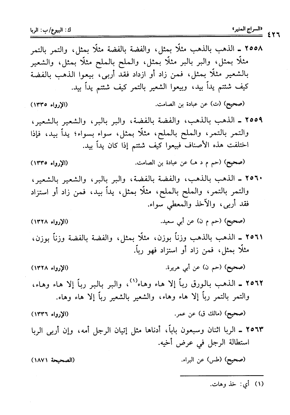 2560 - الذهب بالذهب، والفضة بالفضة، والبر بالبر، والشعير بالشعير، والتمر بالتمر، والملح بالملح، مثلًا بمثل، يدًا بيد، فمن زاد أو استزاد فقد أربى، والآخذ والمعطي سواء.
